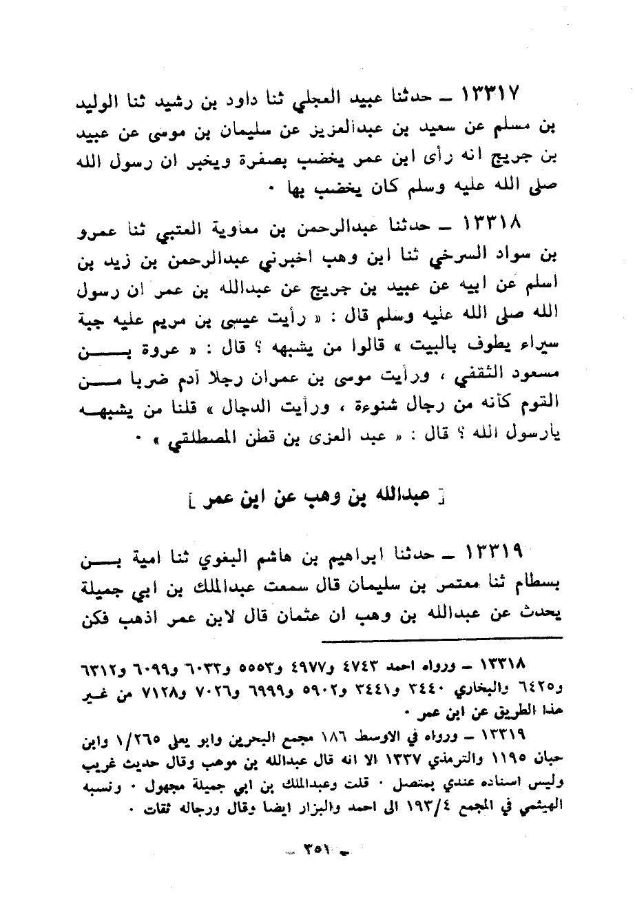 13318 - حَدَّثَنَا عَبْدُ الرَّحْمَنِ بْنُ مُعَاوِيَةَ الْعُتْبِيُّ، ثنا عَمْرُو بْنُ سَوَّادٍ السَّرْحِيُّ، ثنا ابْنُ وَهْبٍ، أَخْبَرَنِي عَبْدُ الرَّحْمَنِ بْنُ زَيْدِ بْنِ أَسْلَمَ، عَنْ أَبِيهِ، عَنِ عُبَيْدِ بْنِ جُرَيْجٍ، عَنْ عَبْدِ اللهِ بْنِ عُمَرَ أَنَّ رَسُولَ اللهِ صَلَّى اللهُ عَلَيْهِ وَسَلَّمَ قَالَ: «§رَأَيْتُ عِيسَى ابْنَ مَرْيَمَ عَلَيْهِ جُبَّةٌ سِيَرَاءَ يَطُوفُ بِالْبَيْتِ» ، قَالُوا: مَنْ يُشْبِهُهُ؟ قَالَ: «عُرْوَةُ بْنُ مَسْعُودٍ الثَّقَفِيُّ، وَرَأَيْتُ مُوسَى بْنَ عِمْرَانَ رَجُلًا آدَمَ ضَرْبًا مِنَ الْقَوْمِ كَأَنَّهُ مِنْ رِجَالِ شَنُوءَةَ، وَرَأَيْتُ الدَّجَّالَ» قُلْنَا: مَنْ يُشْبِهُهُ يَا رَسُولَ اللهِ؟ قَالَ: «عَبْدُ الْعُزَّى بْنُ قَطَنٍ الْمُصْطَلِقِيُّ»