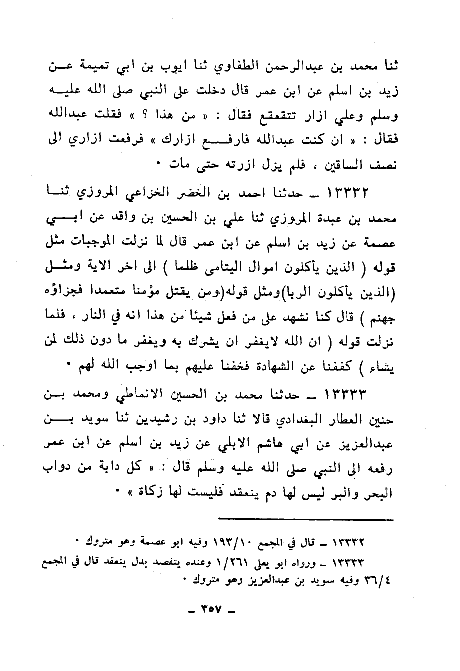 13333 - حَدَّثَنَا مُحَمَّدُ بْنُ الْحُسَيْنِ الْأَنْمَاطِيُّ، وَمُحَمَّدُ بْنُ حُنَيْنٍ الْعَطَّارُ الْبَغْدَادِيُّ، قَالَا: ثنا دَاوُدُ بْنُ رُشَيْدِينَ، ثنا سُوَيْدُ بْنُ عَبْدِ الْعَزِيزِ، عَنْ أَبِي هَاشِمٍ الْأُبُلِّيِّ، عَنْ زَيْدِ بْنِ أَسْلَمَ، عَنِ ابْنِ عُمَرَ رَفَعَهُ إِلَى النَّبِيِّ صَلَّى اللهُ عَلَيْهِ وَسَلَّمَ قَالَ: «§كُلُّ دَابَّةٍ مِنْ دَوَابِّ الْبَحْرِ وَالْبَرِّ لَيْسَ لَهَا دَمٌ يَنْعَقِدُ فَلَيْسَتْ لَهَا زَكَاةٌ»