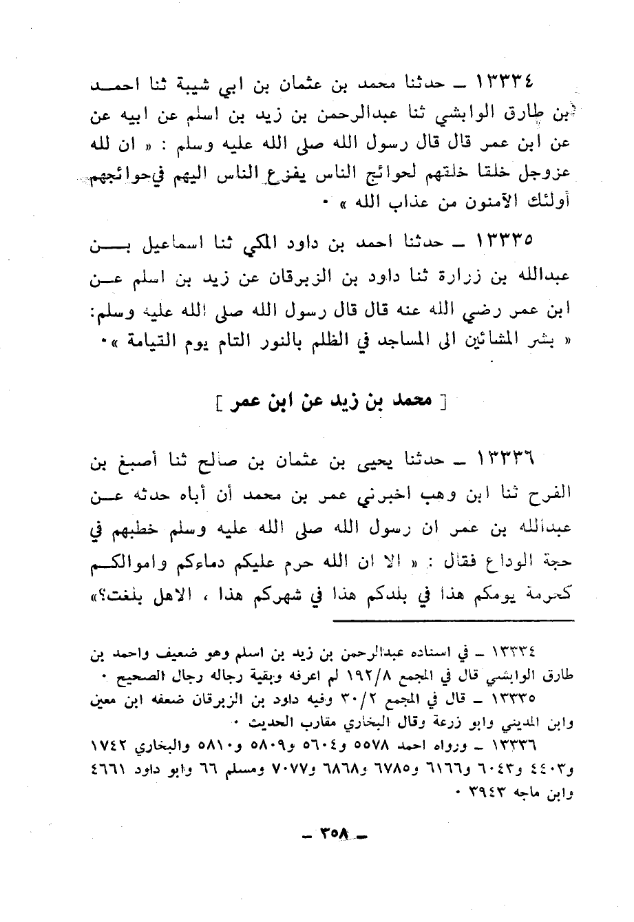 13336 - حَدَّثَنَا يَحْيَى بْنُ عُثْمَانَ بْنِ صَالِحٍ، ثنا أَصْبَغُ بْنُ الْفَرَجِ، ثنا ابْنُ وَهْبٍ، أَخْبَرَنِي عُمَرُ بْنُ مُحَمَّدٍ أَنَّ أَبَاهُ حَدَّثَهُ عَنْ عَبْدِ اللهِ بْنِ عُمَرَ أَنَّ رَسُولَ اللهِ صَلَّى اللهُ عَلَيْهِ وَسَلَّمَ §خَطَبَهُمْ فِي حَجَّةِ الْوَدَاعِ فَقَالَ: «أَلَا إِنَّ اللهَ حَرَّمَ عَلَيْكُمْ دِمَاءَكُمْ، وَأَمْوَالَكُمْ كَحُرْمَةِ يَوْمِكُمْ هَذَا فِي بَلَدِكُمْ هَذَا فِي شَهْرِكُمْ هَذَا، أَلَا هَلْ بَلَّغْتُ؟» ، قَالُوا: نَعَمْ، قَالَ: «اللهُمَّ اشْهَدْ» ، قَالَ: ذَلِكَ ثَلَاثًا، ثُمَّ قَالَ: «انْظُرُوا لَا تَرْجِعُوا بَعْدِي كُفَّارًا يَضْرِبُ بَعْضُكُمْ رِقَابَ بَعْضٍ»