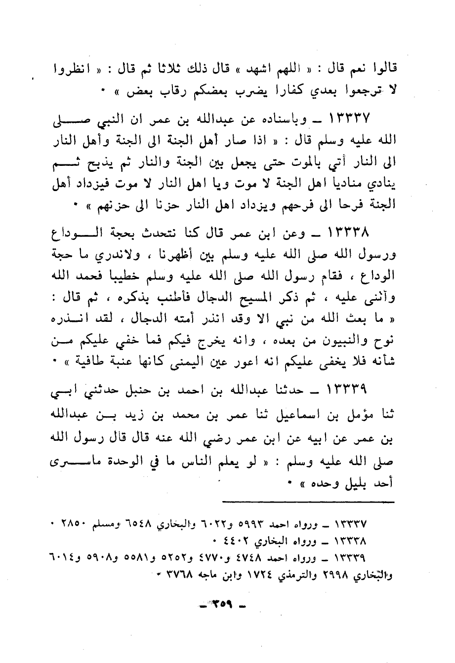 13338 - وَعَنِ ابْنُ عُمَرَ، قَالَ: كُنَّا نَتَحَدَّثُ بِحَجَّةِ الْوَدَاعِ وَرَسُولُ اللهِ صَلَّى اللهُ عَلَيْهِ وَسَلَّمَ بَيْنَ أَظْهُرِنَا، وَلَا نَدْرِي مَا حَجَّةُ الْوَدَاعِ، فَقَامَ رَسُولُ اللهِ صَلَّى اللهُ عَلَيْهِ وَسَلَّمَ خَطِيبًا فَحَمِدَ اللهَ، وَأَثْنَى عَلَيْهِ، ثُمَّ ذَكَرَ الْمَسِيحَ الدَّجَّالَ فَأَطْنَبَ فِي ذِكْرِهِ، ثُمَّ قَالَ: «§مَا بَعَثَ اللهُ مِنْ نَبِيٍّ إِلَّا وَقَدْ أَنْذَرَ أُمَّتَهُ الدَّجَّالَ، لَقَدْ أَنْذَرَهُ نُوحٌ وَالنَّبِيُّونَ مِنْ بَعْدِهِ، وَإِنَّهُ يَخْرُجُ فِيكُمْ فَمَا خَفِيَ عَلَيْكُمْ مِنْ شَأْنِهِ فَلَا يَخْفَى عَلَيْكُمْ أَنَّهُ أَعْوَرُ عَيْنِ الْيُمْنَى كَأَنَّهَا عِنَبَةٌ طَافِيَةٌ»