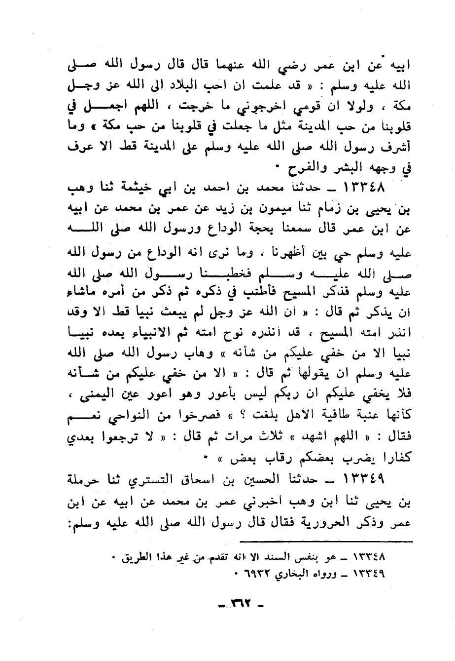 13348 - حَدَّثَنَا مُحَمَّدُ بْنُ أَحْمَدَ بْنِ أَبِي خَيْثَمَةَ، ثنا وَهْبُ بْنُ يَحْيَى بْنِ زِمَامٍ، ثنا مَيْمُونُ بْنُ زَيْدٍ، عَنْ عُمَرَ بْنِ مُحَمَّدٍ، عَنْ أَبِيهِ، عَنِ ابْنِ عُمَرَ، قَالَ: سَمِعْنَا بِحَجَّةِ الْوَدَاعِ وَرَسُولُ اللهِ صَلَّى اللهُ عَلَيْهِ وَسَلَّمَ حَيٌّ بَيْنَ أَظْهُرِنَا، وَمَا نَرَى أَنَّهُ الْوَدَاعَ مِنْ رَسُولِ اللهِ صَلَّى اللهُ عَلَيْهِ وَسَلَّمَ، فَخَطَبَنَا رَسُولُ اللهِ صَلَّى اللهُ عَلَيْهِ وَسَلَّمَ، فَذَكَرَ الْمَسِيحَ فَأَطْنَبَ فِي ذِكْرِهِ، ثُمَّ ذَكَرَ مِنْ أَمْرِهِ مَا شَاءَ أَنْ يَذْكُرَ , ثُمَّ قَالَ: " إِنَّ اللهَ عَزَّ وَجَلَّ لَمْ يَبْعَثْ نَبِيًّا قَطُّ إِلَّا، وَقَدْ أَنْذَرَ أُمَّتَهُ الْمَسِيحَ قَدْ أَنْذَرَهُ نُوحٌ أُمَّتَهُ، ثُمَّ الْأَنْبِيَاءُ بَعْدَهُ نَبِيًّا نَبِيًّا، ثُمَّ قَالَ: أَلَا فَمَنْ خَفِيَ عَلَيْكُمْ مِنْ شَأْنِهِ وَهَابَ رَسُولُ اللهِ صَلَّى اللهُ عَلَيْهِ وَسَلَّمَ أَنْ يَقُولَهَا، ثُمَّ قَالَ: إِلَّا مَنْ خَفِيَ عَلَيْكُمْ مِنْ شَأْنِهِ فَلَا يَخْفَى عَلَيْكُمْ أَنَّ رَبَّكُمْ لَيْسَ بِأَعْوَرَ، وَهُوَ أَعْوَرُ عَيْنِ الْيُمْنَى كَأَنَّهَا عِنَبَةٌ طَافِيَةٌ، أَلَا هَلْ بَلَّغْتُ؟ " فَصَرَخُوا مِنَ النَّوَاحِي: نَعَمْ، فَقَالَ: " اللهُمَّ اشْهَدْ ثَلَاثَ مَرَّاتٍ، ثُمَّ قَالَ: §لَا تَرْجِعُوا بَعْدِي كُفَّارًا يَضْرِبُ بَعْضُكُمْ رِقَابَ بَعْضٍ "
