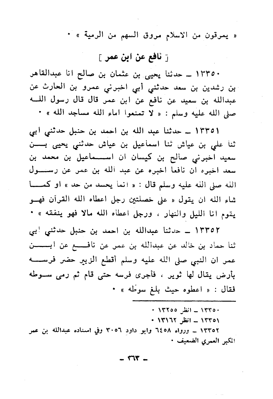 13351 - حَدَّثَنَا عَبْدُ اللهِ بْنُ أَحْمَدَ بْنِ حَنْبَلٍ، حَدَّثَنِي أَبِي، ثنا عَلِيُّ بْنُ عَيَّاشٍ، ثنا إِسْمَاعِيلُ بْنُ عَيَّاشٍ، حَدَّثَنِي يَحْيَى بْنُ سَعِيدٍ، أَخْبَرَنِي صَالِحُ بْنُ كَيْسَانَ أَنَّ إِسْمَاعِيلَ بْنَ مُحَمَّدِ بْنِ سَعْدٍ، أَخْبَرَهِ أَنَّ نَافِعًا أَخْبَرَهُ عَنْ عَبْدِ اللهِ بْنِ عُمَرَ، عَنْ رَسُولِ اللهِ صَلَّى اللهُ عَلَيْهِ وَسَلَّمَ قَالَ: «§إِنَّمَا يَحْسُدُ مَنْ حَسَدَ أَوْ كَمَا شَاءَ اللهُ أَنْ يَقُولَ عَلَى خَصْلَتَيْنِ، رَجُلٌ أَعْطَاهُ اللهُ الْقُرْآنَ فَهُوَ يَقُومُ آنَاءَ اللَّيْلِ وَالنَّهَارِ، وَرَجُلٌ أَعْطَاهُ اللهُ مَالًا فَهُوَ يُنْفِقُهُ»