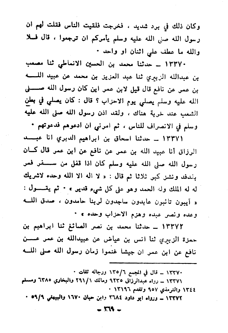 13371 - حَدَّثَنَا إِسْحَاقُ بْنُ إِبْرَاهِيمَ الدَّبَرِيُّ، أنا عَبْدُ الرَّزَّاقِ، أنا عُبَيْدُ اللهِ بْنُ عُمَرَ، عَنْ نَافِعٍ، عَنِ ابْنِ عُمَرَ، قَالَ: كَانَ رَسُولُ اللهِ صَلَّى اللهُ عَلَيْهِ وَسَلَّمَ: إِذَا قَفَلَ مِنْ سَفَرٍ فَمَرَّ بِفَدْفَدٍ أَوْ نَشَزٍ كَبَّرَ ثَلَاثًا ثُمَّ قَالَ: " §لَا إِلَهَ إِلَّا اللهُ وَحْدَهُ لَا شَرِيكَ لَهُ , لَهُ الْمُلْكُ، وَلَهُ الْحَمْدُ، وَهُوَ عَلَى كُلِّ شَيْءٍ قَدِيرٌ , ثُمَّ يَقُولُ: آيِبُونَ تَائِبُونَ عَابِدُونَ سَاجِدُونَ لِرَبِّنَا حَامِدُونَ , صَدَقَ اللهُ وَعْدَهُ , وَنَصَرَ عَبْدَهُ، وَهَزَمَ الْأَحْزَابَ وَحْدَهُ "
