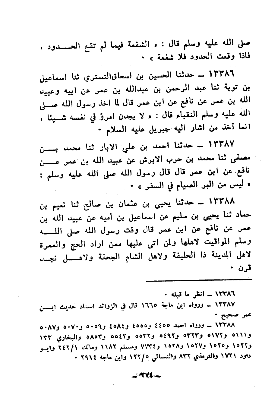 13388 - حَدَّثَنَا يَحْيَى بْنُ عُثْمَانَ بْنِ صَالِحٍ، ثنا نُعَيْمُ بْنُ حَمَّادٍ، ثنا يَحْيَى بْنُ سُلَيْمٍ، عَنْ إِسْمَاعِيلَ بْنِ أُمَيَّةَ، عَنْ عُبَيْدِ اللهِ بْنِ عُمَرَ، عَنْ نَافِعٍ، عَنِ ابْنِ عُمَرَ، قَالَ: «§وَقَّتَ رَسُولُ اللهِ صَلَّى اللهُ عَلَيْهِ وَسَلَّمَ الْمَوَاقِيتَ لِأَهْلِهَا وَلِمَنْ أَتَى عَلَيْهَا مِمَّنْ أَرَادَ الْحَجَّ وَالْعُمْرَةَ لِأَهْلِ الْمَدِينَةِ، ذَا الْحُلَيْفَةِ، وَلِأَهْلِ الشَّامِ، الْجُحْفَةَ، وَلِأَهْلِ نَجْدٍ قَرْنَ»