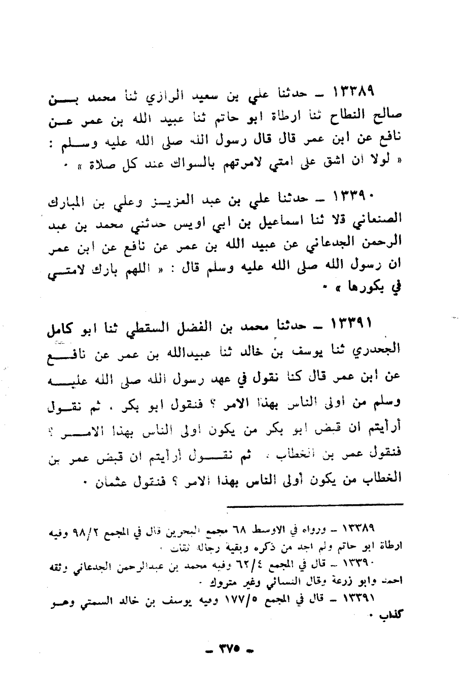 13389 - حَدَّثَنَا عَلِيُّ بْنُ سَعِيدٍ الرَّازِيُّ، ثنا مُحَمَّدُ بْنُ صَالِحٍ النَّطَّاحُ، ثنا أَرْطَاةُ أَبُو حَاتِمٍ، ثنا عُبَيْدُ اللهِ بْنُ عُمَرَ بْنِ نَافِعٍ، عَنِ ابْنِ عُمَرَ، قَالَ: قَالَ رَسُولُ اللهِ صَلَّى اللهُ عَلَيْهِ وَسَلَّمَ: «§لَوْلَا أَنْ أَشُقَّ عَلَى أُمَّتِي لَأَمَرْتُهُمْ بِالسِّوَاكِ عِنْدَ كُلِّ صَلَاةٍ»