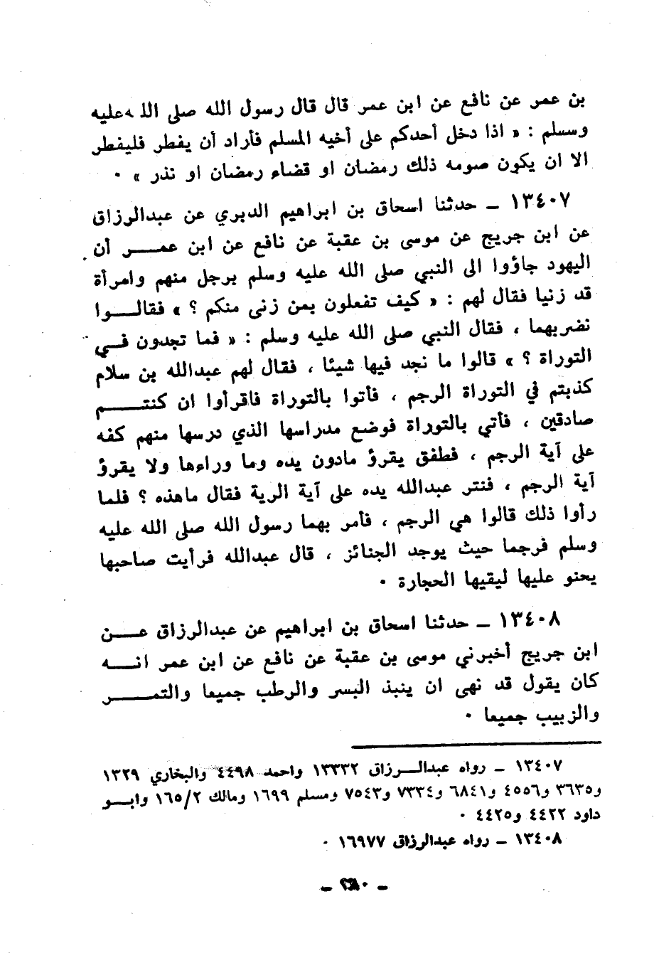 13407 - حَدَّثَنَا إِسْحَاقُ بْنُ إِبْرَاهِيمَ الدَّبَرِيُّ، عَنْ عَبْدِ الرَّزَّاقِ، عَنِ ابْنِ جُرَيْجٍ، عَنْ مُوسَى بْنِ عُقْبَةَ، عَنْ نَافِعٍ، عَنِ ابْنِ عُمَرَ أَنَّ الْيَهُودَ جَاءُوا إِلَى النَّبِيِّ صَلَّى اللهُ عَلَيْهِ وَسَلَّمَ بِرَجُلٍ مِنْهُمْ وَامْرَأَةٍ قَدْ زَنَيَا، فَقَالَ لَهُمْ: «كَيْفَ تَفْعَلُونَ بِمَنْ زَنَى مِنْكُمْ؟» فَقَالُوا: نَضْرِبُهُمَا، فَقَالَ النَّبِيُّ صَلَّى اللهُ عَلَيْهِ وَسَلَّمَ: «§فَمَا تَجِدُونَ فِي التَّوْرَاةِ؟» قَالُوا: مَا نَجِدُ فِيهَا شَيْئًا , فَقَالَ لَهُمْ عَبْدُ اللهِ بْنُ سَلَامٍ كَذَبْتُمْ؛ فِي التَّوْرَاةِ الرَّجْمُ، فَائْتُوا بِالتَّوْرَاةِ فَاقْرَؤُوا إِنْ كُنْتُمْ صَادِقِينَ، فَأُتِيَ بِالتَّوْرَاةِ فَوَضَعَ مِدْرَاسُهَا الَّذِي دَرَسَهَا مِنْهُمْ كَفَّهُ عَلَى آيَةِ الرَّجْمِ، فَطَفِقَ يَقْرَأَ مَا دُونَ يَدِهِ وَمَا وَرَاءَهَا وَلَا يَقْرَأُ آيَةَ الرَّجْمِ، فَنَتَرَ عَبْدُ اللهِ يَدَهُ عَلَى آيَةِ الرَّجْمِ، فَقَالَ: مَا هَذِهِ؟ فَلَمَّا رَأَوْا ذَلِكَ قَالُوا: هِيَ الرَّجْمُ فَأَمَرَ بِهِمَا رَسُولُ اللهِ صَلَّى اللهُ عَلَيْهِ وَسَلَّمَ، فَرُجِمَا حَيْثُ يُوجَدُ الْجِنَائِزُ، قَالَ عَبْدُ اللهِ: فَرَأَيْتُ صَاحِبَهَا يَحْنُو عَلَيْهَا لِيَقِيَهَا الْحِجَارَةَ
