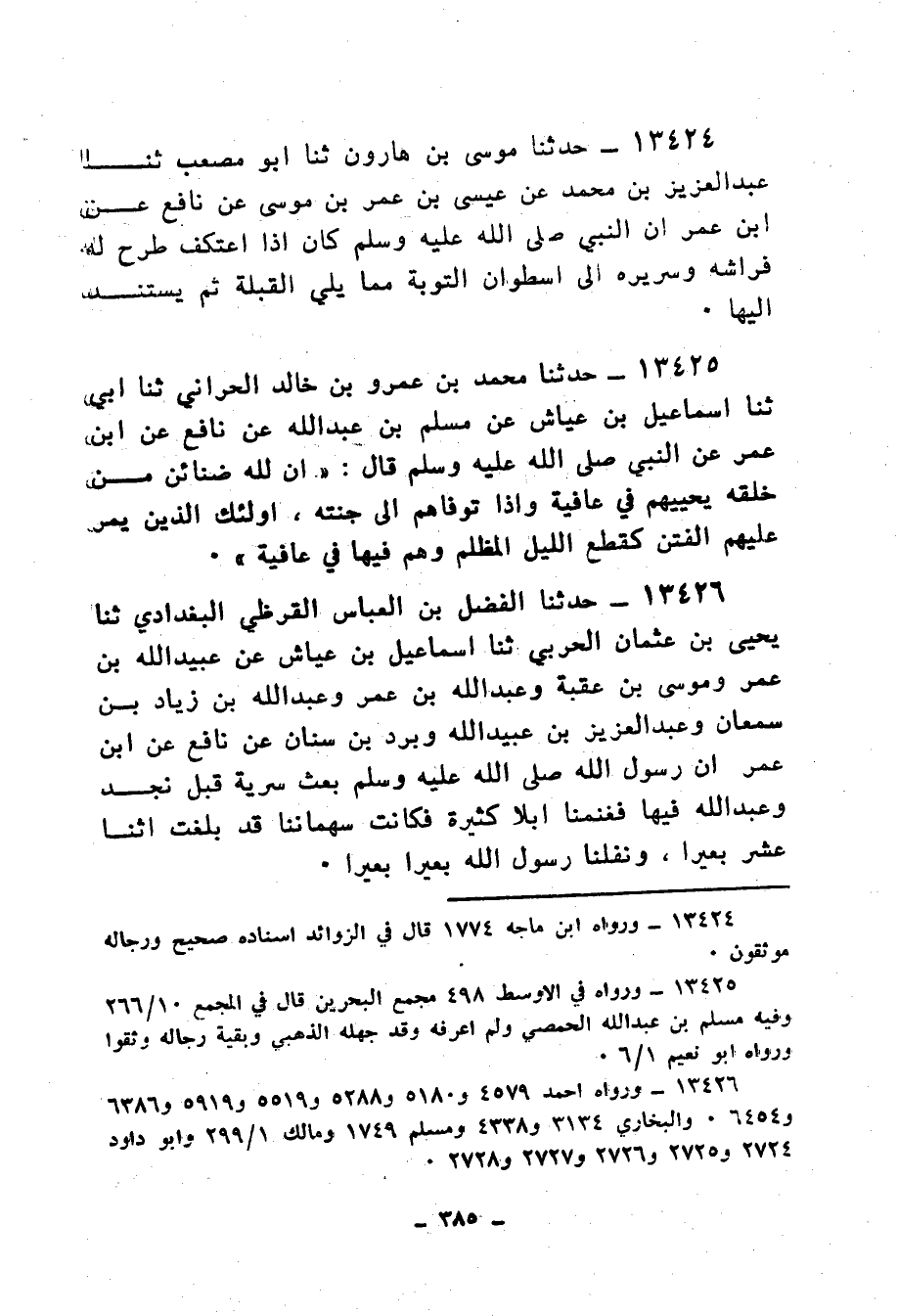 13426 - حَدَّثَنَا الْفَضْلُ بْنُ الْعَبَّاسِ الْقُرَظِيُّ الْبَغْدَادِيُّ، ثنا يَحْيَى بْنُ عُثْمَانَ الْحَرْبِيُّ، ثنا إِسْمَاعِيلُ بْنُ عَيَّاشٍ، عَنْ عُبَيْدِ اللهِ بْنِ عُمَرَ، وَمُوسَى بْنُ عُقْبَةَ، وَعَبْدُ اللهِ بْنُ عُمَرَ، وَعَبْدُ اللهِ بْنُ زِيَادِ بْنِ سَمْعَانَ، وَعَبْدُ الْعَزِيزِ بْنِ عُبَيْدِ اللهِ، وَبُرْدُ بْنُ سِنَانٍ، عَنْ نَافِعٍ، عَنِ ابْنِ عُمَرَ أَنَّ رَسُولَ اللهِ صَلَّى اللهُ عَلَيْهِ وَسَلَّمَ: «§بَعَثَ سَرِيَّةً قِبَلَ نَجْدٍ وَعَبْدُ اللهِ فِيهَا فَغَنِمْنَا إِبِلًا كَثِيرَةً فَكَانَتْ سُهْمَانُنَا قَدْ بَلَغَتِ اثْنَيْ عَشَرَ بَعِيرًا، وَنَفَلَنَا رَسُولُ اللهِ بَعِيرًا بَعِيرًا»