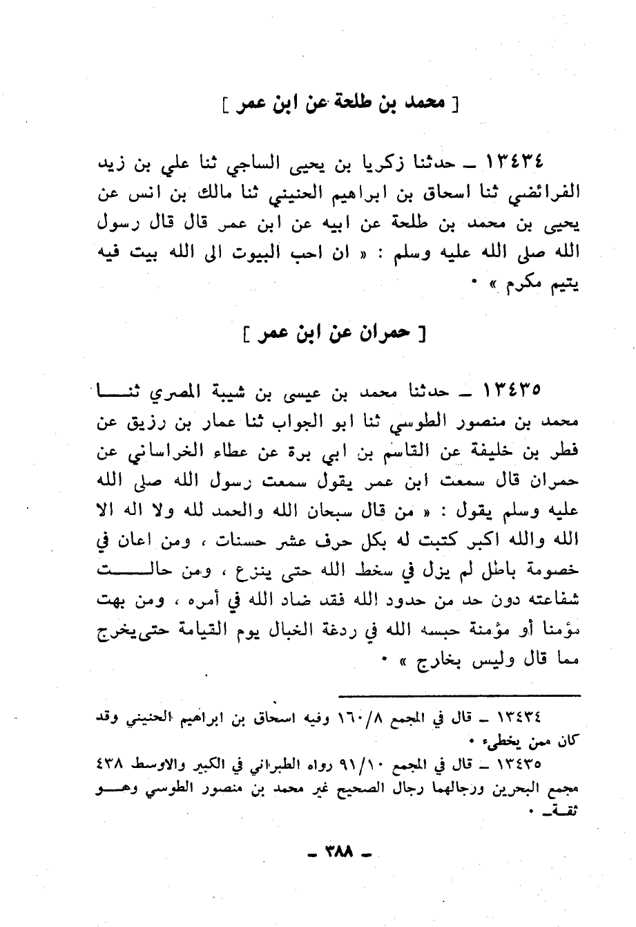 13434 - حَدَّثَنَا زَكَرِيَّا بْنُ يَحْيَى السَّاجِيُّ، ثنا عَلِيُّ بْنُ زَيْدٍ الْفَرَائِضِيُّ، ثنا إِسْحَاقُ بْنُ إِبْرَاهِيمَ الْحُنَيْنِيُّ، ثنا مَالِكُ بْنُ أَنَسٍ، عَنْ يَحْيَى بْنِ مُحَمَّدِ بْنِ طَلْحَةَ، عَنْ أَبِيهِ، عَنِ ابْنِ عُمَرَ، قَالَ: قَالَ رَسُولُ اللهِ صَلَّى اللهُ عَلَيْهِ وَسَلَّمَ: «إِنَّ §أَحَبَّ الْبُيُوتِ إِلَى اللهِ، بَيْتٌ فِيهِ يَتِيمٌ مُكْرَمٌ»