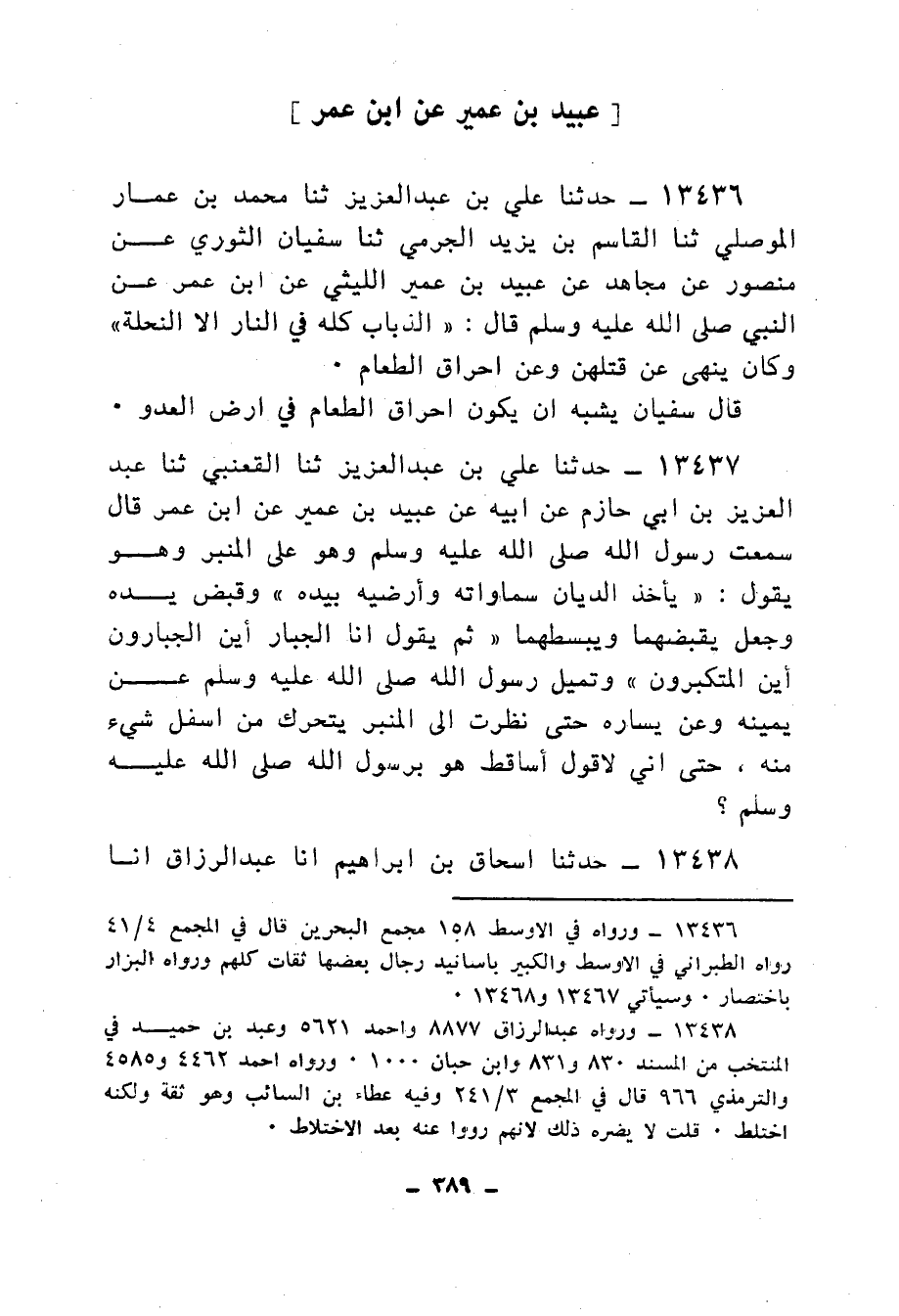 13436 - حَدَّثَنَا عَلِيُّ بْنُ عَبْدِ الْعَزِيزِ، ثنا مُحَمَّدُ بْنُ عَمَّارٍ الْمَوْصِلِيُّ، ثنا الْقَاسِمُ بْنُ يَزِيدَ الْجَرْمِيُّ، ثنا سُفْيَانُ الثَّوْرِيُّ، عَنْ مَنْصُورٍ، عَنْ مُجَاهِدٍ، عَنْ عُبَيْدِ بْنِ عُمَيْرٍ اللَّيْثِيِّ، عَنِ ابْنِ عُمَرَ، عَنِ النَّبِيِّ صَلَّى اللهُ عَلَيْهِ وَسَلَّمَ قَالَ: «§الذُّبَابُ كُلُّهُ فِي النَّارِ إِلَّا النَّحْلَةَ، وَكَانَ يَنْهَى عَنْ قَتْلِهِنَّ، وَعَنْ إِحْرَاقِ الطَّعَامِ» قَالَ سُفْيَانُ: «يُشْبِهُ أَنْ يَكُونَ إِحْرَاقُ الطَّعَامِ فِي أَرْضِ الْعَدُوِّ»