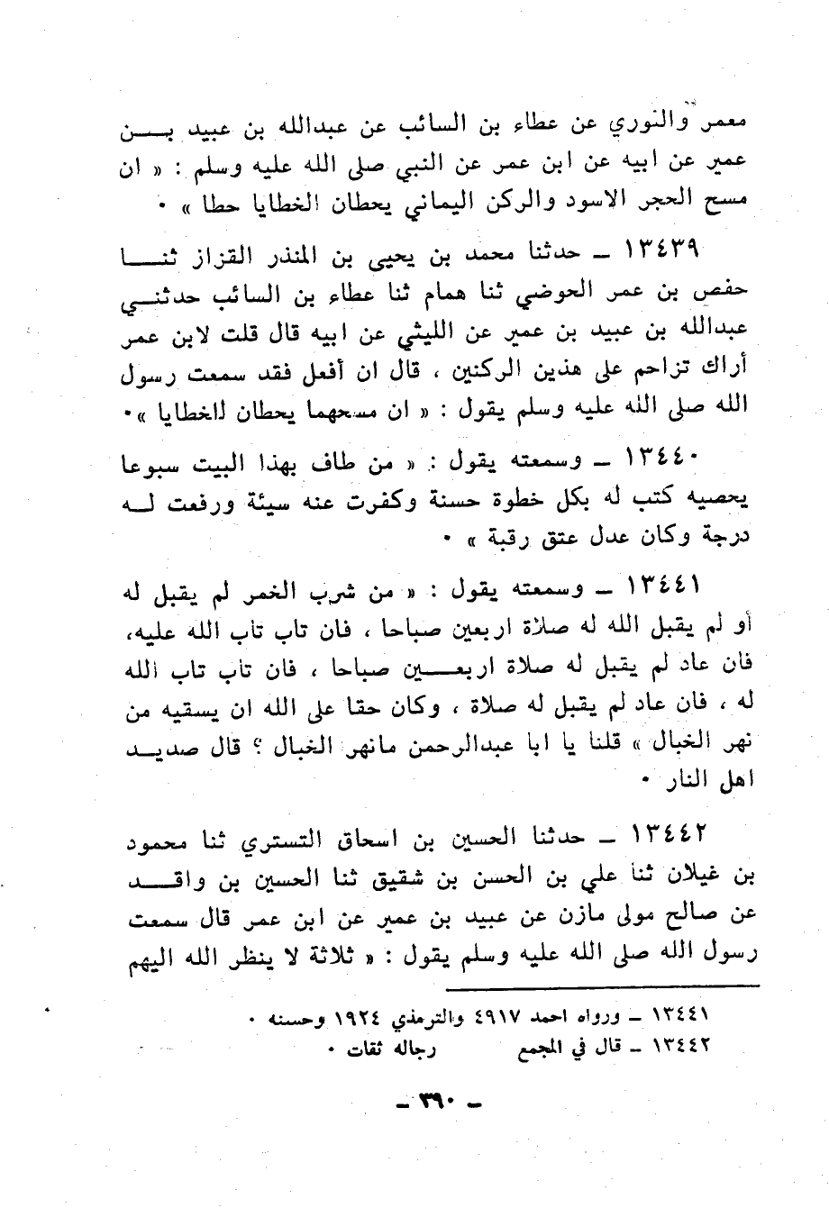 13441 - وَسَمِعْتُهُ يَقُولُ: «§مَنْ شَرِبَ الْخَمْرَ لَمْ يُقْبَلْ لَهُ أَوْ لَمْ يَتَقَبَّلِ اللهُ لَهَ صَلَاةً أَرْبَعِينَ صَبَاحًا، فَإِنْ تَابَ تَابَ اللهُ عَلَيْهِ، فَإِنْ عَادَ لَمْ يُقْبَلْ لَهَ صَلَاةٌ أَرْبَعِينَ صَبَاحًا، فَإِنْ تَابَ تَابَ اللهُ عَلَيْهِ، فَإِنْ عَادَ لَمْ يُقْبَلْ لَهَ صَلَاةٌ، وَكَانَ حَقًّا عَلَى اللهِ أَنْ يَسْقِيَهَ مِنْ نَهَرِ الْخَبَالِ» قُلْنَا: يَا أَبَا عَبْدِ الرَّحْمَنِ مَا نَهَرُ الْخَبَالِ؟ قَالَ: «صَدِيدُ أَهْلِ النَّارِ»
