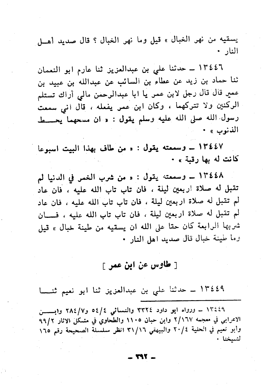 13448 - وَسَمِعْتُهُ يَقُولُ: «§مَنْ شَرِبَ الْخَمْرَ فِي الدُّنْيَا لَمْ تُقْبَلْ لَهُ صَلَاةٌ أَرْبَعِينَ لَيْلَةً فَإِنْ تَابَ تَابَ اللهُ عَلَيْهِ، فَإِنْ عَادَ لَمْ تُقْبَلْ لَهُ صَلَاةٌ أَرْبَعِينَ لَيْلَةً، فَإِنْ تَابَ تَابَ اللهُ عَلَيْهِ، فَإِنْ عَادَ لَمْ تُقْبَلْ لَهُ صَلَاةٌ أَرْبَعِينَ لَيْلَةً، فَإِنْ تَابَ تَابَ اللهُ عَلَيْهِ، فَإِنْ شَرِبَهَا الرَّابِعَةَ كَانَ حَقًّا عَلَى اللهِ أَنْ يَسْقِيَهُ مِنْ طِينَةِ خَبَالٍ» قِيلَ: وَمَا طِينَةُ خَبَالٍ؟ قَالَ: «صَدِيدُ أَهْلِ النَّارِ»