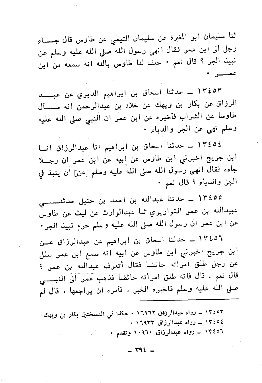 13455 - حَدَّثَنَا عَبْدُ اللهِ بْنُ أَحْمَدَ بْنِ حَنْبَلٍ، حَدَّثَنِي عُبَيْدُ اللهِ بْنُ عُمَرَ الْقَوَارِيرِيُّ، ثنا عَبْدُ الْوَارِثِ، عَنْ لَيْثٍ، عَنْ طَاوُسٍ، عَنِ ابْنِ عُمَرَ: «أَنَّ رَسُولَ اللهِ صَلَّى اللهُ عَلَيْهِ وَسَلَّمَ §حَرَّمَ نَبِيذَ الْجَرِّ»