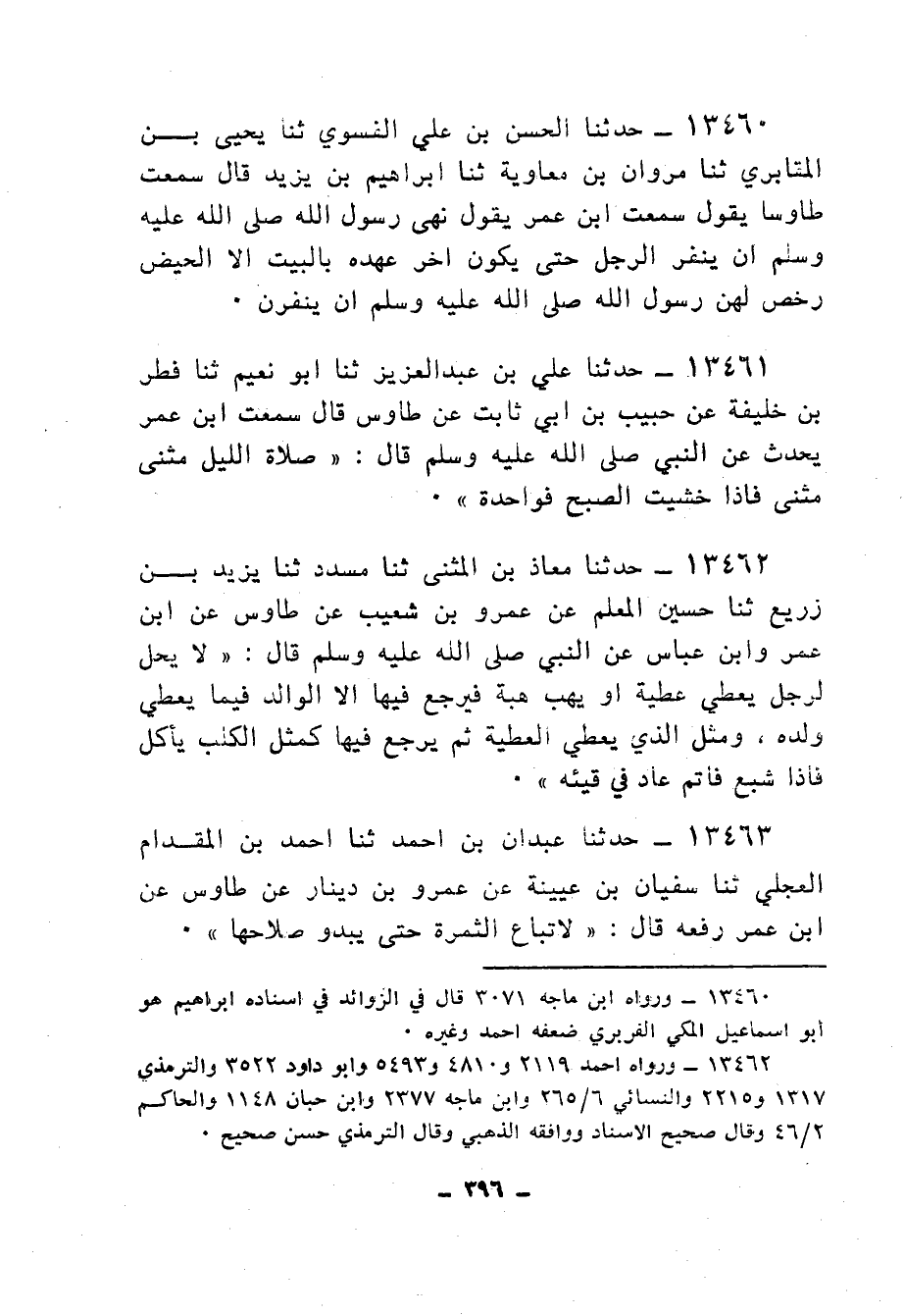 13460 - حَدَّثَنَا الْحَسَنُ بْنُ عَلِيٍّ الْفَسَوِيُّ، ثنا يَحْيَى الْمَقَابِرِيُّ، ثنا مَرْوَانُ بْنُ مُعَاوِيَةَ، ثنا إِبْرَاهِيمُ بْنُ يَزِيدَ، قَالَ: سَمِعْتُ طَاوُسًا، يَقُولُ: سَمِعْتُ ابْنَ عُمَرَ، يَقُولُ: «§نَهَى رَسُولُ اللهِ صَلَّى اللهُ عَلَيْهِ وَسَلَّمَ أَنْ يَنْفِرَ الرَّجُلُ حَتَّى يَكُونَ آخِرُ عَهْدِهِ بِالْبَيْتِ إِلَّا الْحُيَّضَ رَخَّصَ لَهُنَّ رَسُولُ اللهِ صَلَّى اللهُ عَلَيْهِ وَسَلَّمَ، أَنْ يَنْفِرْنَ»