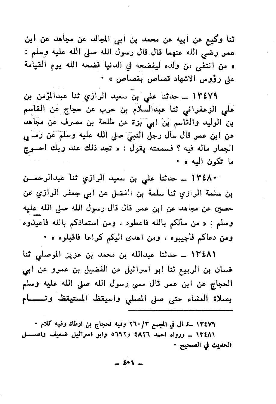 13479 - حَدَّثَنَا عَلِيُّ بْنُ سَعِيدٍ الرَّازِيُّ، ثنا عَبْدُ الْمُؤْمِنِ بْنُ عَلِيٍّ الزَّعْفَرَانِيُّ، ثنا عَبْدُ السَّلَامِ بْنُ حَرْبٍ، عَنْ حَجَّاجٍ، عَنِ الْقَاسِمِ بْنِ الْوَلِيدِ، وَالْقَاسِمُ بْنُ أَبِي بَزَّةَ، عَنْ طَلْحَةَ بْنِ مُصَرِّفٍ، عَنْ مُجَاهِدٍ، عَنِ ابْنِ عُمَرَ، قَالَ: سَأَلَ رَجُلٌ النَّبِيَّ صَلَّى اللهُ عَلَيْهِ وَسَلَّمَ عَنْ رَمْيِ الْجِمَارِ مَا لَهُ فِيهِ؟ فَسَمِعْتُهُ يَقُولُ: «§تَجِدُ ذَلِكَ عِنْدَ رَبِّكَ أَحْوَجَ مَا تَكُونُ إِلَيْهِ»