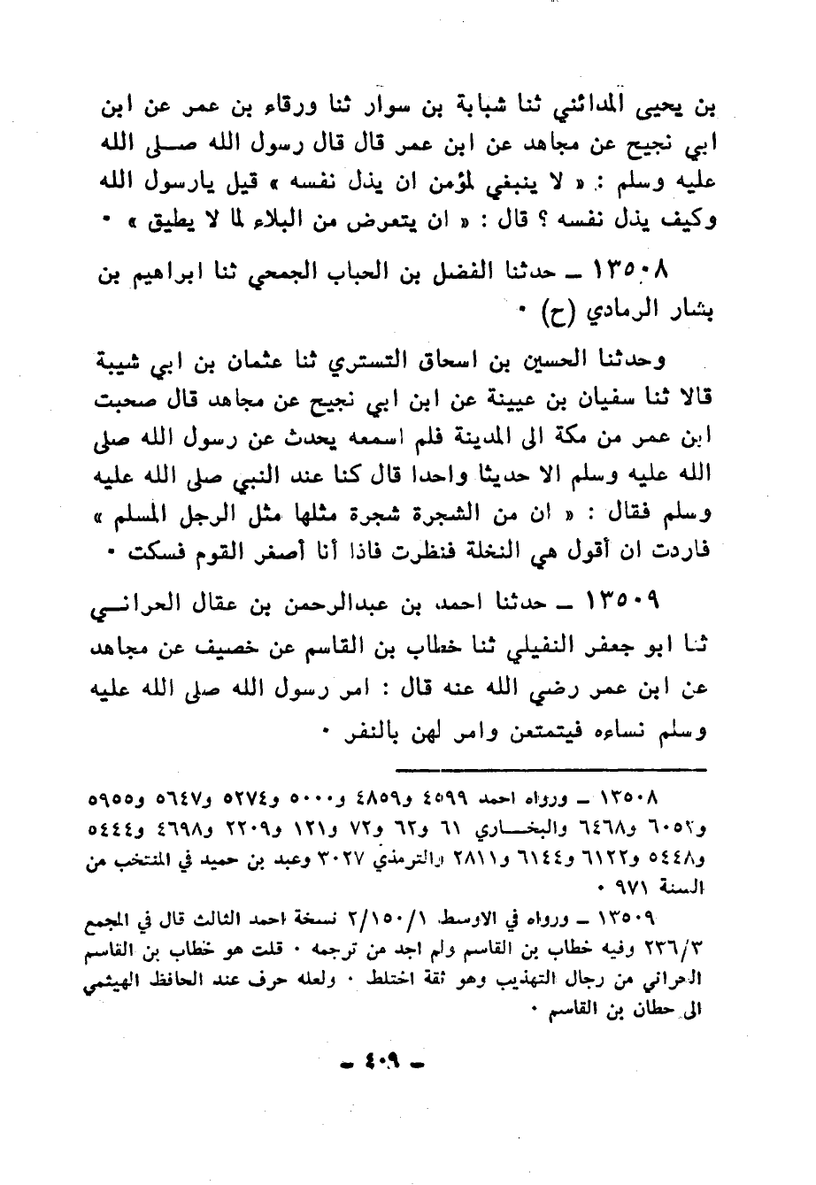 13508 - حَدَّثَنَا الْفَضْلُ بْنُ الْحُبَابِ الْجُمَحِيُّ، ثنا إِبْرَاهِيمُ بْنُ بَشَّارٍ الرَّمَادِيُّ، ح وَحَدَّثَنَا الْحُسَيْنُ بْنُ إِسْحَاقَ التُّسْتَرِيُّ، ثنا عُثْمَانُ بْنُ أَبِي شَيْبَةَ، قَالَا: ثنا سُفْيَانُ بْنُ عُيَيْنَةَ، عَنِ ابْنِ أَبِي نَجِيحٍ، عَنْ مُجَاهِدٍ، قَالَ: صَحِبْتُ ابْنَ عُمَرَ مِنْ مَكَّةَ إِلَى الْمَدِينَةِ فَلَمْ أَسْمَعْهُ يُحَدِّثُ عَنْ رَسُولِ اللهِ صَلَّى اللهُ عَلَيْهِ وَسَلَّمَ، إِلَّا حَدِيثًا وَاحِدًا قَالَ: كُنَّا عِنْدَ النَّبِيِّ صَلَّى اللهُ عَلَيْهِ وَسَلَّمَ فَقَالَ: «إِنَّ §مِنَ الشَّجَرَةِ شَجَرَةً، مَثَلُهَا مَثَلُ الرَّجُلِ الْمُسْلِمِ» ، فَأَرَدْتُ أَنْ أَقُولَ هِيَ النَّخْلَةُ، فَنَظَرْتُ فَإِذَا أَنَا أَصْغَرُ الْقَوْمِ فَسَكَتُّ