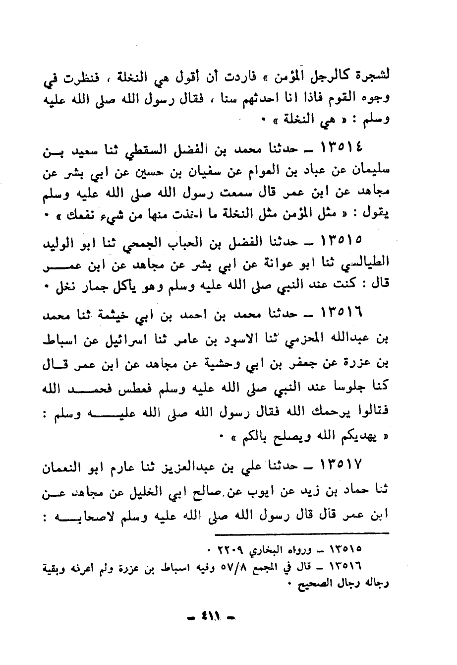 13517 - حَدَّثَنَا عَلِيُّ بْنُ عَبْدِ الْعَزِيزِ، ثنا عَارِمٌ أَبُو النُّعْمَانِ، ثنا حَمَّادُ بْنُ زَيْدٍ، عَنْ أَيُّوبَ، عَنْ صَالِحٍ أَبِي الْخَلِيلِ، عَنْ مُجَاهِدٍ، عَنِ ابْنِ عُمَرَ، قَالَ: قَالَ رَسُولُ اللهِ صَلَّى اللهُ عَلَيْهِ وَسَلَّمَ لِأَصْحَابِهِ: «§أَخْبِرُونِي عَنْ شَجَرَةٍ مَثَلُهَا مَثَلُ الْمُؤْمِنِ» ، فَجَعَلَ النَّاسُ يَذْكُرُونَ شَجَرًا مِنْ شَجَرِ الْوَادِي، فَأُلْقِيَ فِي نَفْسِي أَنَّهَا النَّخْلَةُ فَجَعَلْتُ أُرِيدُ أَنْ أَقُولَ، فَأَرَى أَسْنَانًا مِنَ الْقَوْمِ فَجَعَلْتُ أَهَابُ ذَاكَ، فَقَالَ رَسُولُ اللهِ صَلَّى اللهُ عَلَيْهِ وَسَلَّمَ: «هِيَ النَّخْلَةُ»