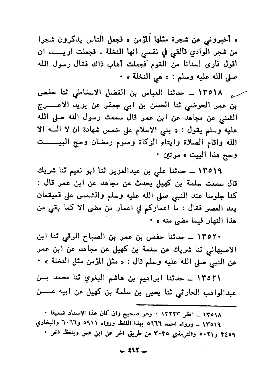 13520 - حَدَّثَنَا حَفْصُ بْنُ عُمَرَ بْنِ الصَّبَّاحِ الرَّقِّيُّ، ثنا ابْنُ الْأَصْبَهَانِيِّ، ثنا شَرِيكٌ، عَنْ سَلَمَةَ بْنِ كُهَيْلٍ، عَنْ مُجَاهِدٍ، عَنِ ابْنِ عُمَرَ، عَنِ النَّبِيِّ صَلَّى اللهُ عَلَيْهِ وَسَلَّمَ قَالَ: «§مَثَلُ الْمُؤْمِنِ مَثَلُ النَّخْلَةِ»