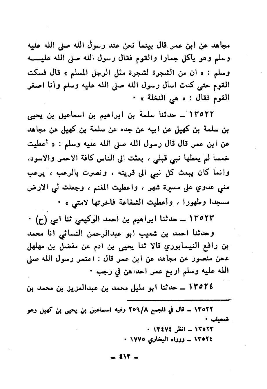13523 - حَدَّثَنَا إِبْرَاهِيمُ بْنُ أَحْمَدَ الْوَكِيعِيُّ، ثنا أَبِي، ح وَحَدَّثَنَا أَحْمَدُ بْنُ شُعَيْبٍ أَبُو عَبْدِ الرَّحْمَنِ النَّسَائِيُّ، أنا مُحَمَّدُ بْنُ رَافِعٍ النَّيْسَابُورِيُّ، قَالَا: ثنا يَحْيَى بْنُ آدَمَ، عَنْ مُفَضَّلِ بْنِ مُهَلْهَلٍ، عَنْ مَنْصُورٍ، عَنْ مُجَاهِدٍ، عَنِ ابْنِ عُمَرَ، قَالَ: «§اعْتَمَرَ رَسُولُ اللهِ صَلَّى اللهُ عَلَيْهِ وَسَلَّمَ أَرْبَعَ عُمَرٍ إِحْدَاهُنَّ فِي رَجَبٍ»