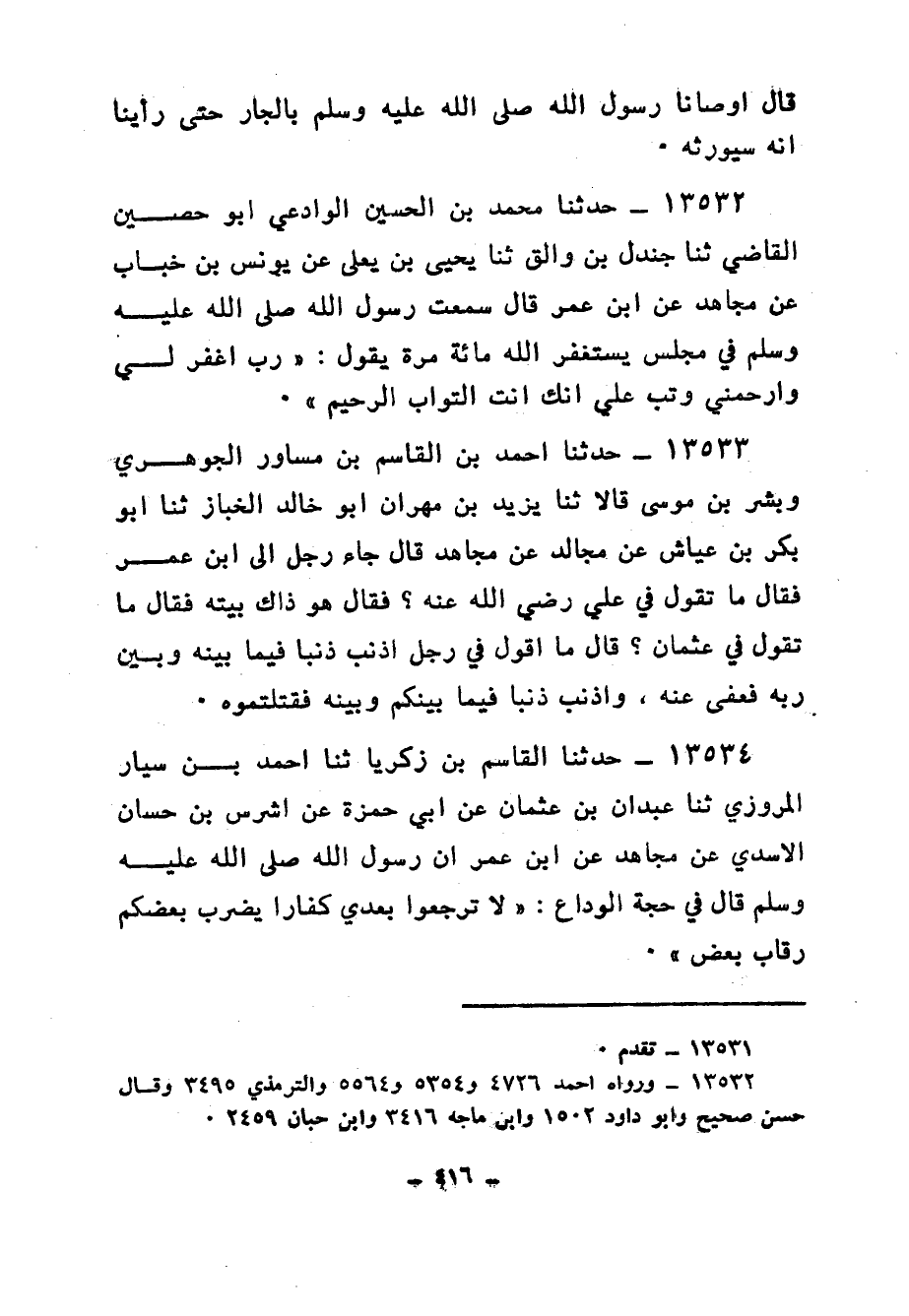 13534 - حَدَّثَنَا الْقَاسِمُ بْنُ زَكَرِيَّا، ثنا أَحْمَدُ بْنُ سَيَّارٍ الْمَرْوَزِيُّ، ثنا عَبْدَانُ بْنُ عُثْمَانَ، عَنْ أَبِي حَمْزَةَ، عَنْ أَشْرَسَ بْنِ حَسَّانَ الْأَسَدِيِّ، عَنْ مُجَاهِدٍ، عَنِ ابْنِ عُمَرَ أَنَّ رَسُولَ اللهِ صَلَّى اللهُ عَلَيْهِ وَسَلَّمَ قَالَ فِي حَجَّةِ الْوَدَاعِ: «§لَا تَرْجِعُوا بَعْدِي كُفَّارًا يَضْرِبُ بَعْضُكُمْ رِقَابَ بَعْضٍ»