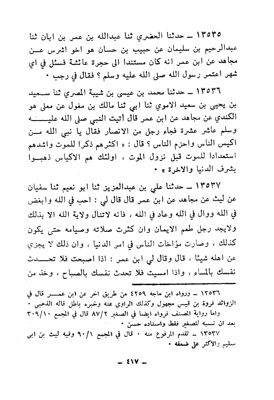 13536 - حَدَّثَنَا مُحَمَّدُ بْنُ عِيسَى بْنِ شَيْبَةَ الْمِصْرِيُّ، ثنا سَعِيدُ بْنُ يَحْيَى بْنِ سَعِيدٍ الْأُمَوِيُّ، ثنا أَبِي، ثنا مَالِكُ بْنُ مِغْوَلٍ، عَنْ مُعَلًّى هُوَ الْكِنْدِيُّ، عَنْ مُجَاهِدٍ، عَنِ ابْنِ عُمَرَ، قَالَ: أَتَيْتُ النَّبِيَّ صَلَّى اللهُ عَلَيْهِ وَسَلَّمَ عَاشِرَ عَشَرَةٍ , فَجَاءَ رَجُلٌ مِنَ الْأَنْصَارِ فَقَالَ: يَا نَبِيَّ اللهِ مَنْ أَكْيَسُ النَّاسِ؟ وَأَحْزَمُ النَّاسِ؟ قَالَ: «§أَكْثَرُهُمْ ذِكْرًا لِلْمَوْتِ، وَأَشَدُّهُمُ اسْتِعْدَادًا لِلْمَوْتِ قَبْلَ نُزُولِ الْمَوْتِ أُولَئِكَ هُمُ الْأَكْيَاسُ ذَهَبُوا بِشَرَفِ الدُّنْيَا وَالْآخِرَةِ»