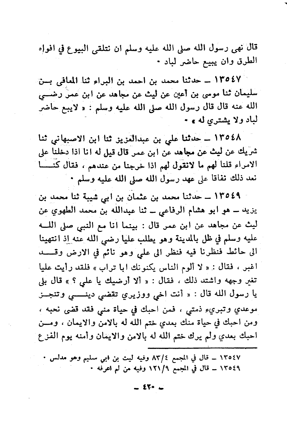 13549 - حَدَّثَنَا مُحَمَّدُ بْنُ عُثْمَانَ بْنِ أَبِي شَيْبَةَ، ثنا مُحَمَّدُ بْنُ يَزِيدَ هُوَ أَبُو هِشَامٍ الرِّفَاعِيُّ، ثنا عَبْدُ اللهِ بْنُ مُحَمَّدٍ الطُّهَوِيُّ، عَنْ لَيْثٍ، عَنْ مُجَاهِدٍ، عَنِ ابْنِ عُمَرَ، قَالَ: بَيْنَمَا أَنَا مَعَ النَّبِيِّ صَلَّى اللهُ عَلَيْهِ وَسَلَّمَ فِي ظِلٍّ بِالْمَدِينَةِ وَهُوَ يَطْلُبُ عَلِيًّا رَضِيَ اللهُ عَنْهُ إِذِ انْتَهَيْنَا إِلَى حَائِطٍ، فَنَظَرْنَا فِيهِ فَنَظَرَ إِلَى عَلِيٍّ وَهُوَ نَائِمٌ فِي الْأَرْضِ، وَقَدْ أَغْبَرَ فَقَالَ: «لَا أَلُومُ النَّاسَ يُكَنُّونَكَ أَبَا تُرَابٍ» ، فَلَقَدْ رَأَيْتُ عَلِيًّا تَغَيَّرَ وَجْهُهُ، وَاشْتَدَّ ذَلِكَ عَلَيْهِ فَقَالَ: «أَلَا أُرْضِيكَ يَا عَلِيُّ؟» قَالَ: بَلَى يَا رَسُولَ اللهِ، قَالَ: «§أَنْتَ أَخِي، وَوَزِيرِي تَقْضِي دَيْنِي وَتُنْجِزُ مَوْعِدِي، وَتُبْرِئُ ذِمَّتِي، فَمَنْ أَحَبَّكَ فِي حَيَاةٍ مِنِّي فَقَدْ قَضَى، نحبه، وَمَنْ أَحَبَّكَ في حياة منك بَعْدِي ختم الله له بالأمن والإيمان، ومن أحبك بعدي وَلَمْ يَرَكَ خَتَمَ اللهُ لَهُ بِالْأَمْنِ وَالْإِيمَانِ، وَأَمَّنَهُ يَوْمَ الْفَزَعِ الْأَكْبَرِ، وَمَنْ مَاتَ وَهُوَ يَبْغَضُكَ يَا عَلِيُّ مَاتَ مِيتَةً جَاهِلِيَّةً، يُحَاسِبُهُ اللهُ بِمَا عَمِلَ فِي الْإِسْلَامِ»