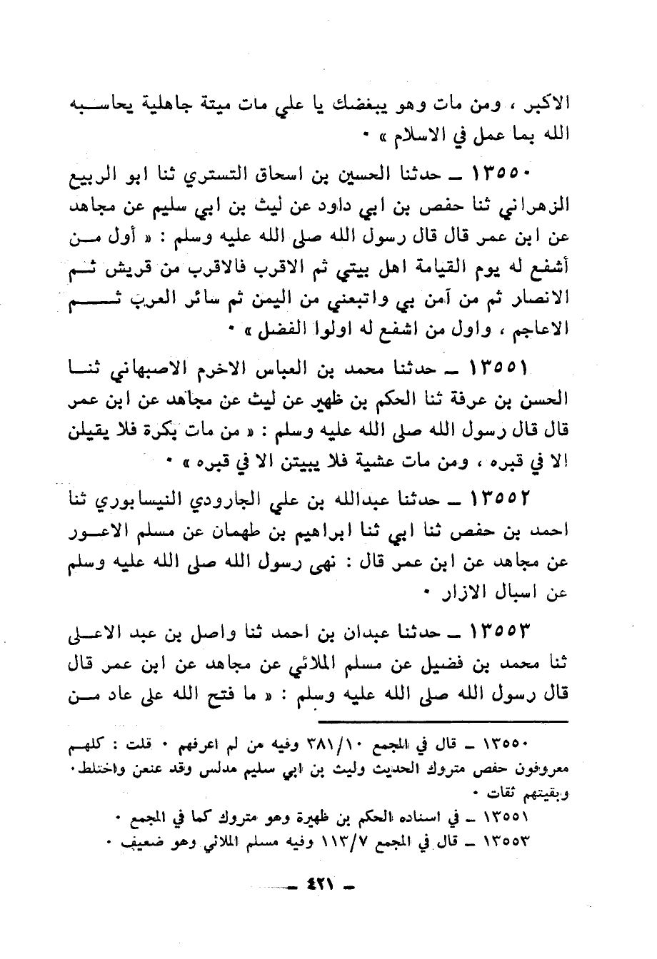 13551 - حَدَّثَنَا مُحَمَّدُ بْنُ الْعَبَّاسِ الْأَخْرَمُ الْأَصْبَهَانِيُّ، ثنا الْحَسَنُ بْنُ عَرَفَةَ، ثنا الْحَكَمُ بْنُ ظُهَيْرٍ، عَنْ لَيْثٍ، عَنْ مُجَاهِدٍ، عَنِ ابْنِ عُمَرَ، قَالَ: قَالَ رَسُولُ اللهِ صَلَّى اللهُ عَلَيْهِ وَسَلَّمَ: «§مَنْ مَاتَ بُكْرَةً، فَلَا يَقِيلَنَّ إِلَّا فِي قَبْرِهِ، وَمَنْ مَاتَ عَشِيَّةً فَلَا يَبِيتَنَّ إِلَّا فِي قَبْرِهِ»