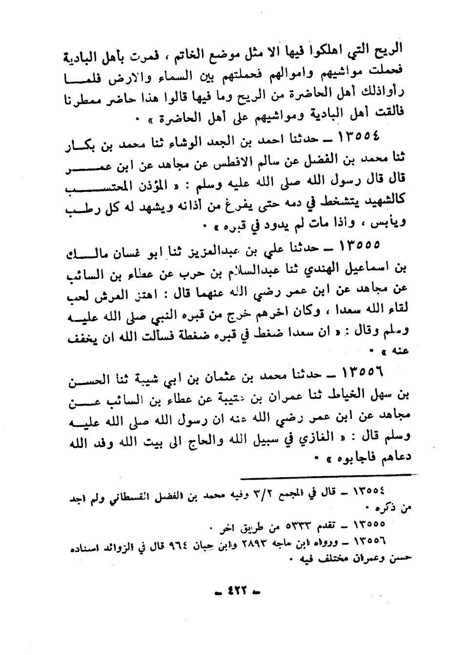 13554 - حَدَّثَنَا أَحْمَدُ بْنُ الْجَعْدِ الْوَشَّاءُ، ثنا مُحَمَّدُ بْنُ بَكَّارٍ، ثنا مُحَمَّدُ بْنُ الْفَضْلِ، عَنْ سَالِمٍ الْأَفْطَسِ، عَنْ مُجَاهِدٍ، عَنِ ابْنِ عُمَرَ، قَالَ: قَالَ رَسُولُ اللهِ صَلَّى اللهُ عَلَيْهِ وَسَلَّمَ: «§الْمُؤَذِّنُ الْمُحْتَسِبُ كَالشَّهِيدِ يَتَشَخَّطُ فِي دَمِهِ حَتَّى يَفْرُغَ مِنْ أَذَانِهِ، وَيَشْهَدُ لَهُ كُلُّ رَطْبٍ وَيَابِسٍ وَإِذَا مَاتَ لَمْ يُدَوَّدْ فِي قَبْرِهِ»