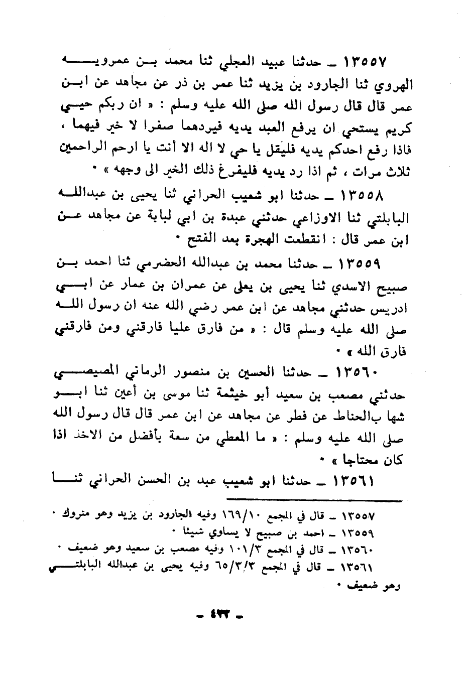 13557 - حَدَّثَنَا عُبَيْدٌ الْعِجْلُ، ثنا مُحَمَّدُ بْنُ عَمْرَوَيْهِ الْهَرَوِيُّ، ثنا الْجَارُودُ بْنُ يَزِيدَ، ثنا عُمَرُ بْنُ ذَرٍّ، عَنْ مُجَاهِدٍ، عَنِ ابْنِ عُمَرَ، قَالَ: قَالَ رَسُولُ اللهِ صَلَّى اللهُ عَلَيْهِ وَسَلَّمَ: " إِنَّ §رَبَّكُمْ حَيِيٌّ كَرِيمٌ يَسْتَحْيِي أَنْ يَرْفَعَ الْعَبْدُ يَدَيْهِ فَيَرُدُّهُمَا صِفَرًا لَا خَيْرَ فِيهِمَا، فَإِذَا رَفَعَ أَحَدُكُمْ يَدَيْهِ فَلْيَقُلْ: يَا حَيُّ لَا إِلَهَ إِلَّا أَنْتَ يَا أَرْحَمَ الرَّاحِمِينَ ثَلَاثَ مَرَّاتٍ، ثُمَّ إِذَا رَدَّ يَدَيْهِ فَلْيُفْرِغْ ذَلِكَ الْخَيْرَ إِلَى وَجْهِهِ "