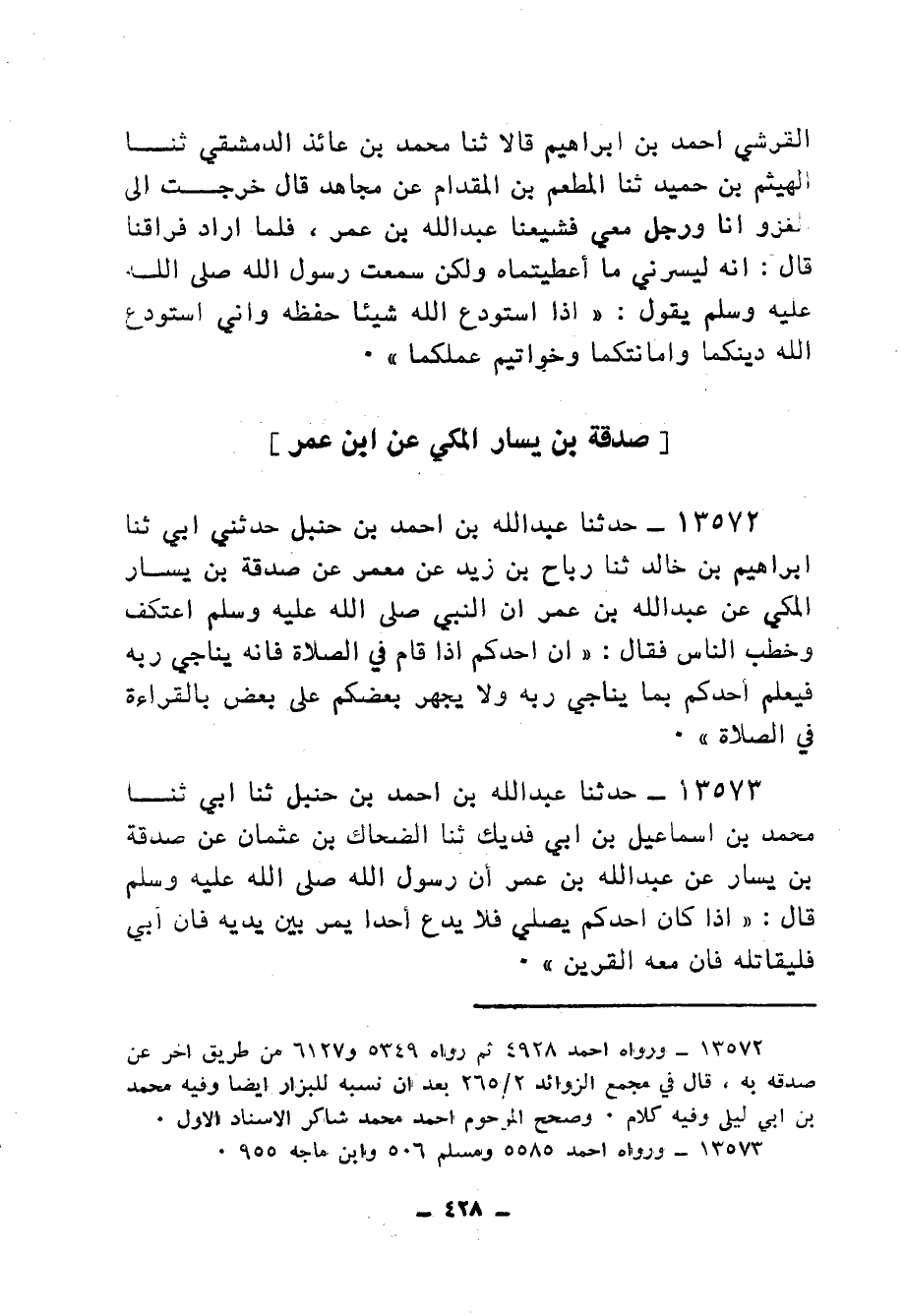 13572 - حَدَّثَنَا عَبْدُ اللهِ بْنُ أَحْمَدَ بْنِ حَنْبَلٍ، حَدَّثَنِي أَبِي، ثنا إِبْرَاهِيمُ بْنُ خَالِدٍ، ثنا رَبَاحُ بْنُ زَيْدٍ، عَنْ مَعْمَرٍ، عَنْ صَدَقَةَ بْنِ يَسَارٍ الْمَكِّيِّ، عَنْ عَبْدِ اللهِ بْنِ عُمَرَ أَنَّ النَّبِيَّ صَلَّى اللهُ عَلَيْهِ وَسَلَّمَ، اعْتَكَفَ، وَخَطَبَ النَّاسَ , فَقَالَ: «إِنَّ أَحَدَكُمْ §إِذَا قَامَ فِي الصَّلَاةِ فَإِنَّهُ يُنَاجِي رَبَّهُ فَيَعْلَمُ أَحَدُكُمْ بِمَا يُنَاجِي رَبَّهُ، وَلَا يَجْهَرْ بَعْضُكُمْ عَلَى بَعْضٍ بِالْقِرَاءَةِ فِي الصَّلَاةِ»