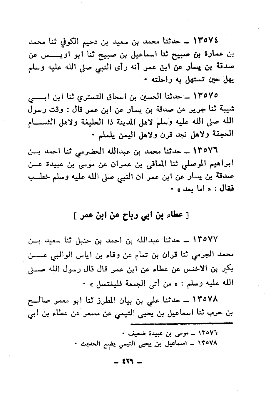 13576 - حَدَّثَنَا مُحَمَّدُ بْنُ عَبْدِ اللهِ الْحَضْرَمِيُّ، ثنا أَحْمَدُ بْنُ إِبْرَاهِيمَ الْمَوْصِلِيُّ، ثنا الْمُعَافَى بْنُ عِمْرَانَ، عَنْ مُوسَى بْنِ عُبَيْدَةَ، عَنْ صَدَقَةَ بْنِ يَسَارٍ، عَنِ ابْنِ عُمَرَ أَنَّ النَّبِيَّ صَلَّى اللهُ عَلَيْهِ وَسَلَّمَ خَطَبَ فَقَالَ: «§أَمَّا بَعْدُ»