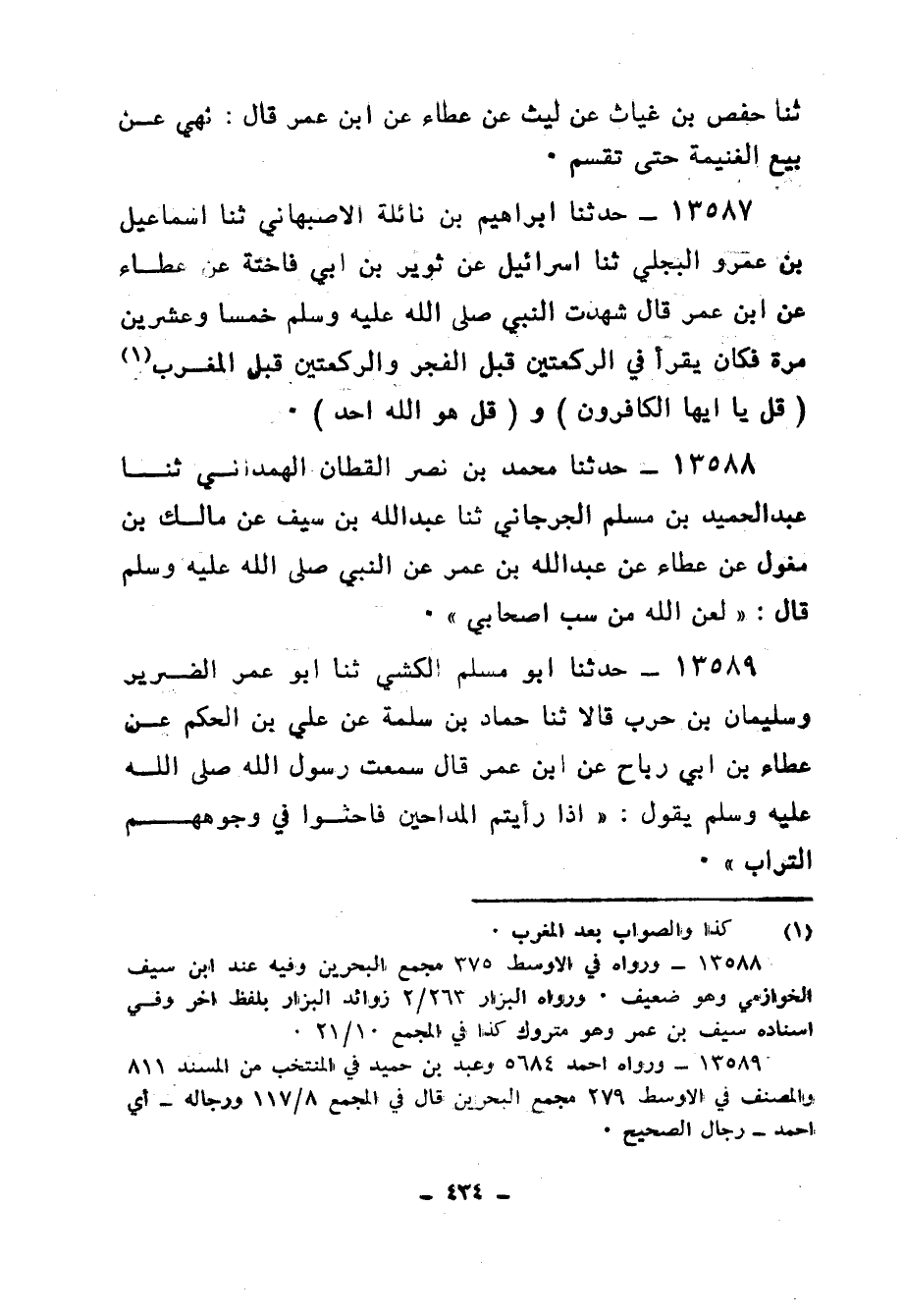 13588 - حَدَّثَنَا مُحَمَّدُ بْنُ نَصْرٍ الْقَطَّانُ الْهَمْدَانِيُّ، ثنا عَبْدُ الْحَمِيدِ بْنُ مُسْلِمٍ الْجُرْجَانِيُّ، ثنا عَبْدُ اللهِ بْنُ سَيْفٍ، عَنْ مَالِكِ بْنِ مِغْوَلٍ، عَنْ عَطَاءٍ، عَنْ عَبْدِ اللهِ بْنِ عُمَرَ، عَنِ النَّبِيِّ صَلَّى اللهُ عَلَيْهِ وَسَلَّمَ قَالَ: «§لَعَنَ اللهُ مَنْ سَبَّ أَصْحَابِي»