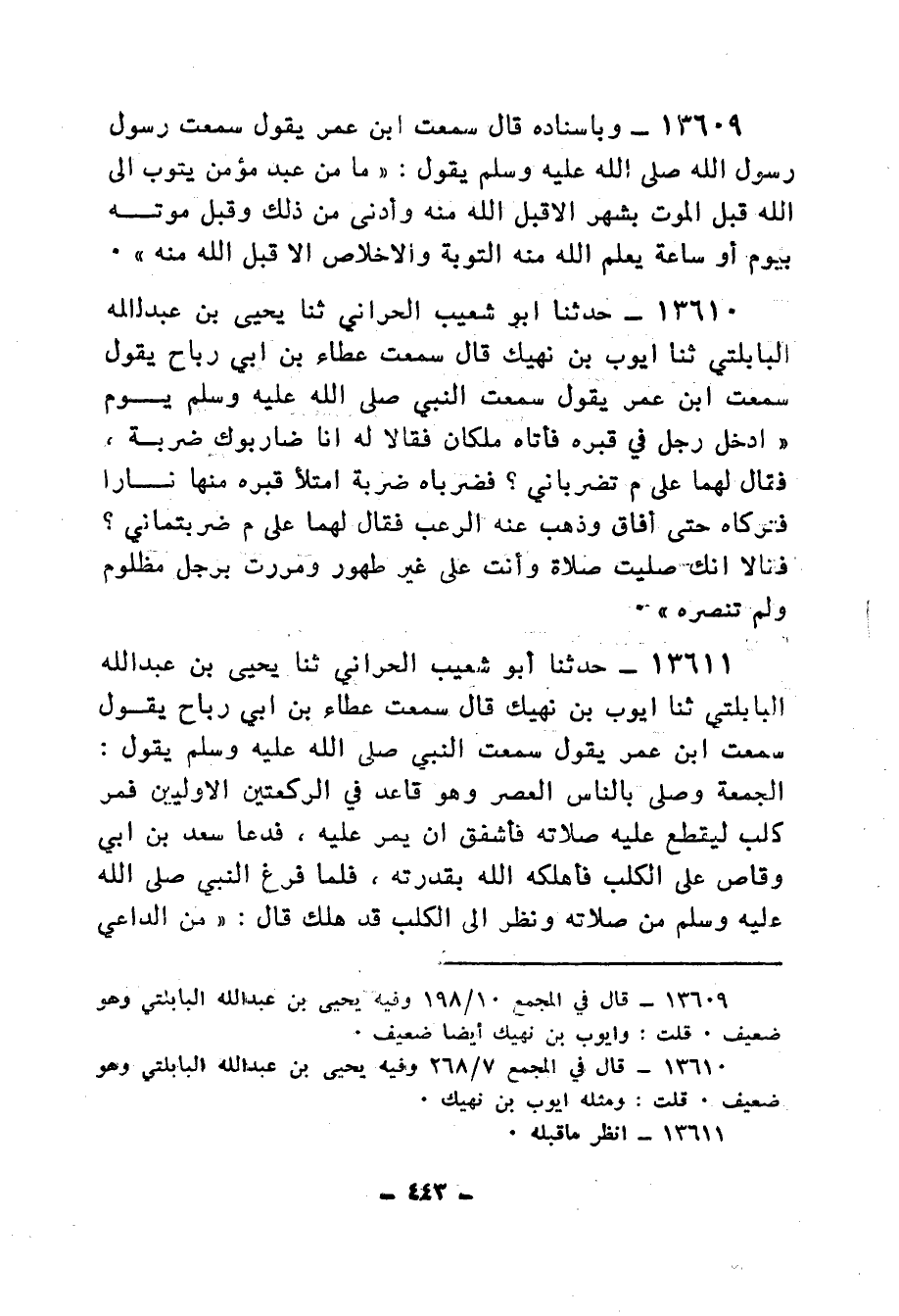 13610 - حَدَّثَنَا أَبُو شُعَيْبٍ الْحَرَّانِيُّ، ثنا يَحْيَى بْنُ عَبْدِ اللهِ الْبَابْلُتِّيُّ، ثنا أَيُّوبُ بْنُ نَهِيكٍ، قَالَ: سَمِعْتُ عَطَاءَ بْنَ أَبِي رَبَاحٍ، يَقُولُ: سَمِعْتُ ابْنَ عُمَرَ، يَقُولُ: سَمِعْتُ النَّبِيَّ صَلَّى اللهُ عَلَيْهِ وَسَلَّمَ: " §يَوْمَ أُدْخِلَ رَجُلٌ فِي قَبْرِهِ، فَأَتَاهُ مَلَكَانَ فَقَالَا لَهُ: إِنَّا ضَارِبُوكَ ضَرْبَةً، فَقَالَ لَهُمَا: عَلَامَ تَضْرِبَانِي؟ فَضَرَبَاهُ ضَرْبَةً امْتَلَأَ قَبْرُهُ مِنْهَا نَارًا، فَتَرَكَاهُ حَتَّى أَفَاقَ وَذَهَبَ عَنْهُ الرُّعْبُ، فَقَالَ لَهُمَا عَلَامَ ضَرَبْتُمَانِي؟ فَقَالَا: إِنَّكَ صَلَّيْتَ صَلَاةً، وَأَنْتَ عَلَى غَيْرِ طُهُورٍ، وَمَرَرْتَ بِرَجُلٍ مَظْلُومٍ وَلَمْ تَنْصُرْهُ "