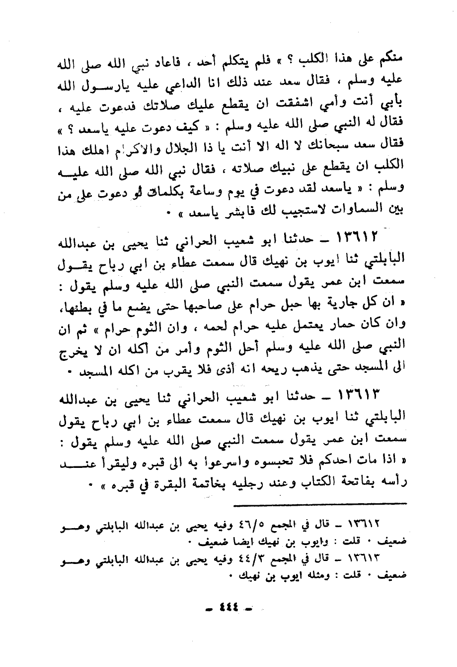 13613 - حَدَّثَنَا أَبُو شُعَيْبٍ الْحَرَّانِيُّ، ثنا يَحْيَى بْنُ عَبْدِ اللهِ الْبَابْلُتِّيُّ، ثنا أَيُّوبُ بْنُ نَهِيكٍ، قَالَ: سَمِعْتُ عَطَاءَ بْنَ أَبِي رَبَاحٍ، يَقُولُ: سَمِعْتُ ابْنَ عُمَرَ، يَقُولُ: سَمِعْتُ النَّبِيَّ صَلَّى اللهُ عَلَيْهِ وَسَلَّمَ يَقُولُ: «§إِذَا مَاتَ أَحَدُكُمْ فَلَا تَحْبِسُوهُ، وَأَسْرِعُوا بِهِ إِلَى قَبْرِهِ، وَلْيُقْرَأْ عِنْدَ رَأْسِهِ بِفَاتِحَةِ الْكِتَابِ، وَعِنْدَ رِجْلَيْهِ بِخَاتِمَةِ الْبَقَرَةِ فِي قَبْرِهِ»
