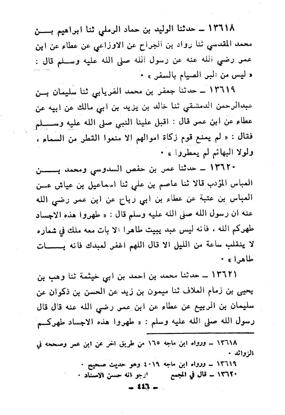 13618 - حَدَّثَنَا الْوَلِيدُ بْنُ حَمَّادٍ الرَّمْلِيُّ، ثنا إِبْرَاهِيمُ بْنُ مُحَمَّدٍ الْمَقْدِسِيُّ، ثنا رَوَّادُ بْنُ الْجَرَّاحِ، عَنِ الْأَوْزَاعِيِّ، عَنْ عَطَاءٍ، عَنِ ابْنِ عُمَرَ رَضِيَ اللهُ عَنْهُ، عَنْ رَسُولِ اللهِ صَلَّى اللهُ عَلَيْهِ وَسَلَّمَ قَالَ: «§لَيْسَ مِنَ الْبِرِّ الصِّيَامُ فِي السَّفَرِ»