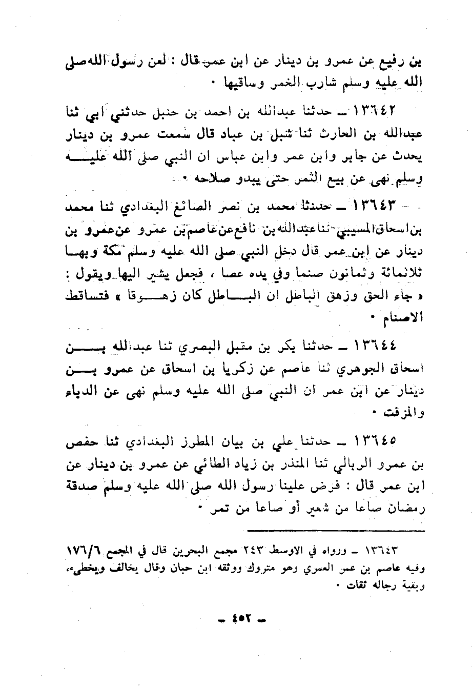 13645 - حَدَّثَنَا عَلِيُّ بْنُ بَيَانٍ الْمُطَرِّزُ الْبَغْدَادِيُّ، ثنا حَفْصُ بْنُ عَمْرٍو الرَّبَالِيُّ، ثنا الْمُنْذِرُ بْنُ زِيَادٍ الطَّائِيُّ، عَنْ عَمْرِو بْنِ دِينَارٍ، عَنِ ابْنِ عُمَرَ، قَالَ: «§فَرَضَ عَلَيْنَا رَسُولُ اللهِ صَلَّى اللهُ عَلَيْهِ وَسَلَّمَ صَدَقَةَ رَمَضَانَ صَاعًا مِنْ شَعِيرٍ، أَوْ صَاعًا مِنْ تَمْرٍ»