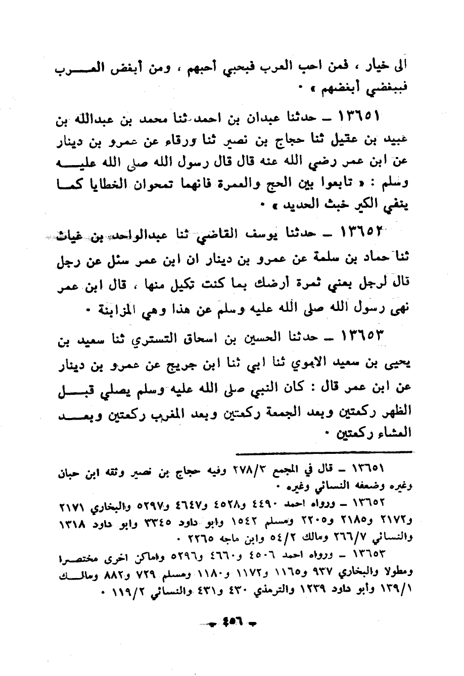 13651 - حَدَّثَنَا عَبْدَانُ بْنُ أَحْمَدَ، ثنا مُحَمَّدُ بْنُ عَبْدِ اللهِ بْنِ عُبَيْدِ بْنِ عَقِيلٍ، ثنا حَجَّاجُ بْنُ نُصَيْرٍ، ثنا وَرْقَاءُ، عَنْ عَمْرِو بْنِ دِينَارٍ، عَنِ ابْنِ عُمَرَ رَضِيَ اللهُ عَنْهُ، قَالَ: قَالَ رَسُولُ اللهِ صَلَّى اللهُ عَلَيْهِ وَسَلَّمَ: «§تَابِعُوا بَيْنَ الْحَجِّ وَالْعُمْرَةِ، فَإِنَّهُمَا يَمْحُوانِ الْخَطَايَا كَمَا يَنْفِي الْكِيرُ خَبَثَ الْحَدِيدِ»