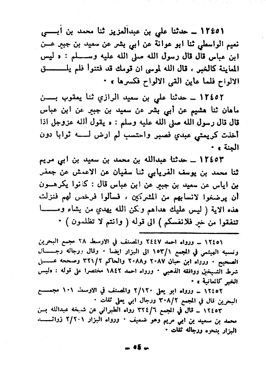12452 - حَدَّثَنَا عَلِيُّ بْنُ سَعِيدٍ الرَّازِيُّ، ثنا يَعْقُوبُ بْنُ مَاهَانَ، ثنا هُشَيْمٌ، عَنْ أَبِي بِشْرٍ، عَنْ سَعِيدِ بْنِ جُبَيْرٍ، عَنِ ابْنِ عَبَّاسٍ قَالَ: قَالَ رَسُولُ اللهِ صَلَّى اللهُ عَلَيْهِ وَسَلَّمَ: " يَقُولُ اللهُ عَزَّ وَجَلَّ: §إِذَا أَخَذْتُ كَرِيمَتَيْ عَبْدِي فَصَبَرَ، وَاحْتَسَبَ لَمْ أَرْضَ لَهُ ثَوَابًا دُونَ الْجَنَّةِ "