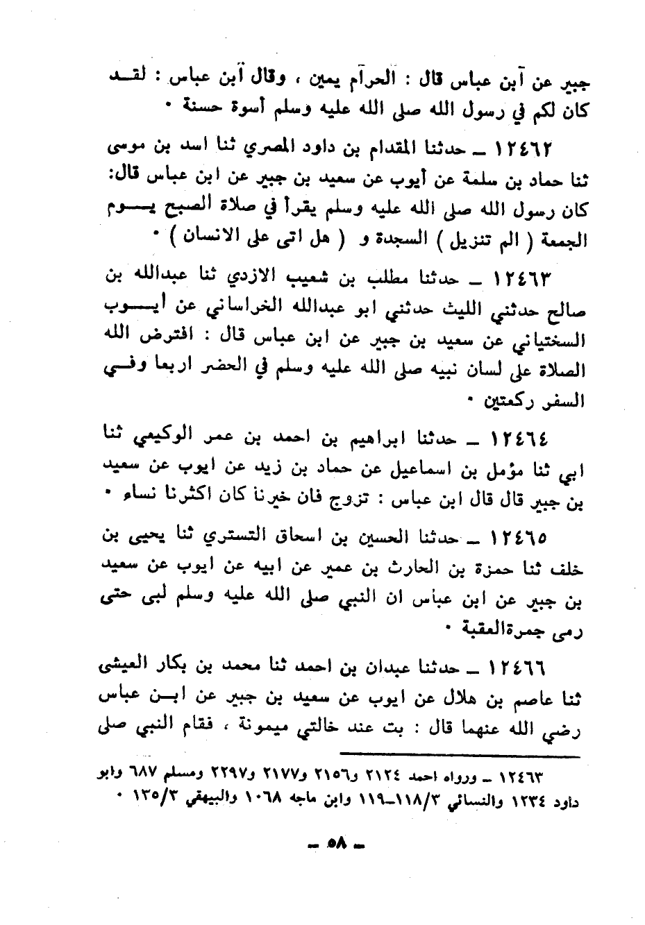 12462 - حَدَّثَنَا الْمِقْدَامُ بْنُ دَاوُدَ الْمِصْرِيُّ، ثنا أَسَدُ بْنُ مُوسَى، ثنا حَمَّادُ بْنُ سَلَمَةَ، عَنْ أَيُّوبَ، عَنْ سَعِيدِ بْنِ جُبَيْرٍ، عَنِ ابْنِ عَبَّاسٍ قَالَ: كَانَ رَسُولُ اللهِ صَلَّى اللهُ عَلَيْهِ وَسَلَّمَ: «§يَقْرَأُ فِي صَلَاةِ الصُّبْحِ يَوْمَ الْجُمُعَةِ الْم تَنْزِيلُ السَّجْدَةَ وَهَلْ أَتَى عَلَى الْإِنْسَانِ»