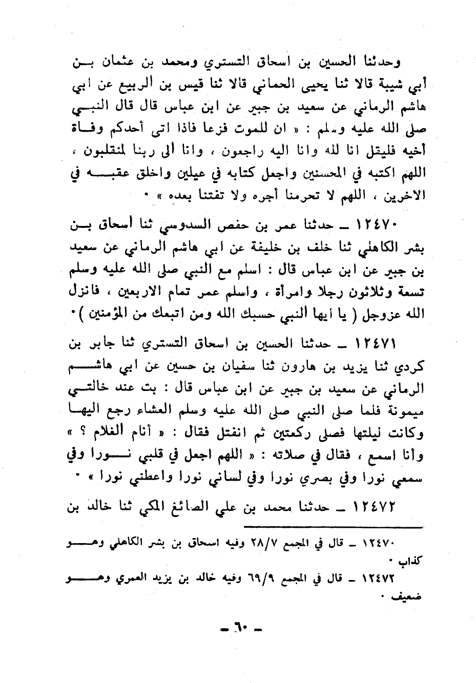 12471 - حَدَّثَنَا الْحُسَيْنُ بْنُ إِسْحَاقَ التُّسْتَرِيُّ، ثنا جَابِرُ بْنُ كُرْدِيٍّ، ثنا يَزِيدُ بْنُ هَارُونَ، ثنا سُفْيَانُ بْنُ حُسَيْنٍ، عَنْ أَبِي هَاشِمٍ الرُّمَّانِيِّ، عَنْ سَعِيدِ بْنِ جُبَيْرٍ، عَنِ ابْنِ عَبَّاسٍ قَالَ: بِتُّ عِنْدَ خَالَتِي مَيْمُونَةَ، فَلَمَّا صَلَّى النَّبِيُّ صَلَّى اللهُ عَلَيْهِ وَسَلَّمَ الْعِشَاءَ رَجَعَ إِلَيْهَا، وَكَانَتْ لَيْلَتُهَا , فَصَلَّى رَكْعَتَيْنِ، ثُمَّ انْفَتَلَ , فَقَالَ: «أَنَامَ الْغُلَامُ؟» وَأَنَا أَسْمَعُ، فَقَالَ فِي صَلَاتِهِ: «§اللهُمَّ , اجْعَلْ فِي قَلْبِي نُورًا، وَفِي سَمْعِي نُورًا، وَفِي بَصَرِي نُورًا، وَفِي لِسَانِي نُورًا، وَاعْطِنِي نُورًا»