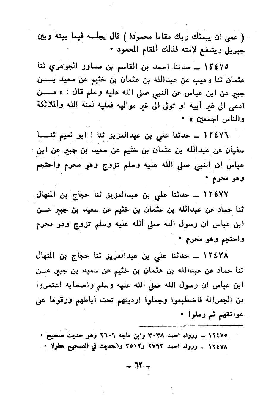 12477 - حَدَّثَنَا عَلِيُّ بْنُ عَبْدِ الْعَزِيزِ، ثنا حَجَّاجُ بْنُ الْمِنْهَالِ، ثنا حَمَّادٌ، عَنْ عَبْدِ اللهِ بْنِ عُثْمَانَ بْنِ خُثَيْمٍ، عَنْ سَعِيدِ بْنِ جُبَيْرٍ، عَنِ ابْنِ عَبَّاسٍ أَنَّ رَسُولَ اللهِ صَلَّى اللهُ عَلَيْهِ وَسَلَّمَ: «§تَزَوَّجَ وَهُوَ مُحْرِمٌ، وَاحْتَجَمَ وَهُوَ مُحْرِمٌ»