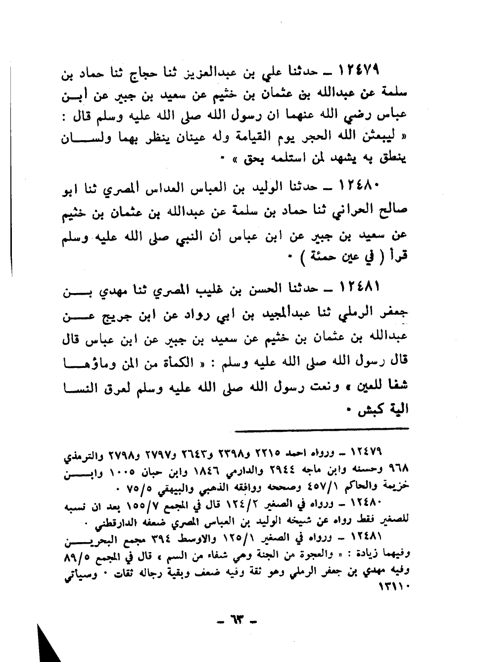 12481 - حَدَّثَنَا الْحَسَنُ بْنُ غُلَيْبٍ الْمِصْرِيُّ، ثنا مَهْدِيُّ بْنُ جَعْفَرٍ الرَّمْلِيُّ، ثنا عَبْدُ الْمَجِيدِ بْنُ أَبِي رَوَّادٍ، عَنِ ابْنِ جُرَيْجٍ، عَنْ عَبْدِ اللهِ بْنِ عُثْمَانَ بْنِ خُثَيْمٍ، عَنْ سَعِيدِ بْنِ جُبَيْرٍ، عَنِ ابْنِ عَبَّاسٍ قَالَ: قَالَ رَسُولُ اللهِ صَلَّى اللهُ عَلَيْهِ وَسَلَّمَ: «§الْكَمْأَةُ مِنَ الْمَنِّ، وَمَاؤُهَا شِفَاءٌ لِلْعَيْنِ»