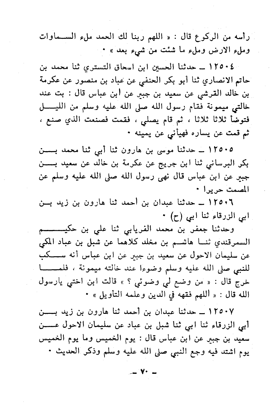 12504 - حَدَّثَنَا الْحُسَيْنُ بْنُ إِسْحَاقَ التُّسْتَرِيُّ، ثنا مُسْلِمُ بْنُ حَاتِمٍ الْأَنْصَارِيُّ، ثنا أَبُو بَكْرٍ الْحَنَفِيُّ، عَنْ عَبَّادِ بْنِ مَنْصُورٍ، عَنْ عِكْرِمَةَ بْنِ خَالِدٍ الْقُرَشِيِّ، عَنْ سَعِيدِ بْنِ جُبَيْرٍ، عَنِ ابْنِ عَبَّاسٍ قَالَ: بِتُّ عِنْدَ خَالَتِي مَيْمُونَةَ، «فَقَامَ رَسُولُ اللهِ صَلَّى اللهُ عَلَيْهِ وَسَلَّمَ، مِنَ اللَّيْلِ §فَتَوَضَّأَ ثَلَاثًا ثَلَاثًا، ثُمَّ قَامَ يُصَلِّي فَقُمْتُ فَصَنَعْتُ الَّذِي صَنَعَ، ثُمَّ قُمْتُ، عَنْ يَسَارِهِ فَهَيَّأَنِي عَنْ يَمِينِهِ»
