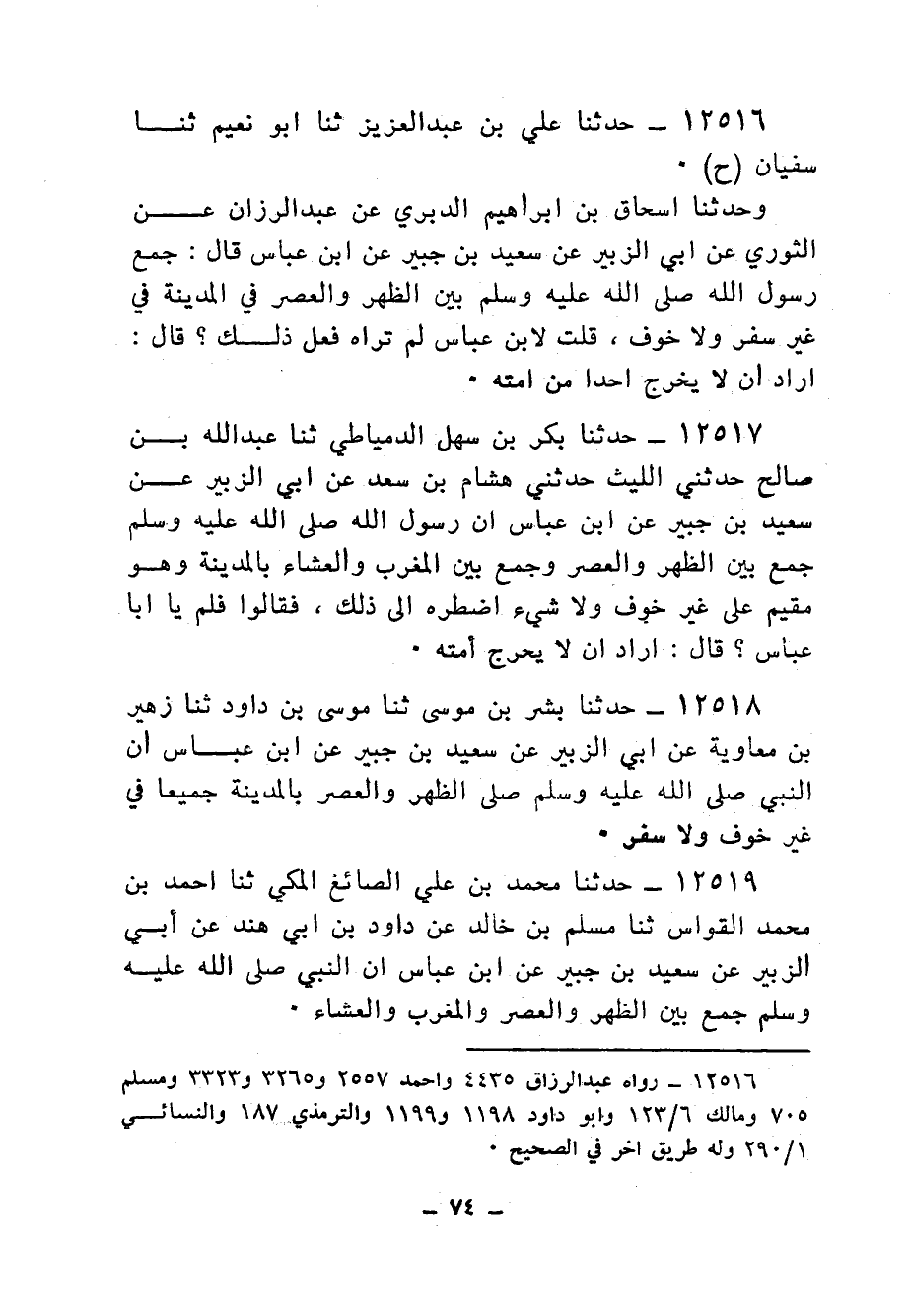 12516 - حَدَّثَنَا عَلِيُّ بْنُ عَبْدِ الْعَزِيزِ، ثنا أَبُو نُعَيْمٍ، ثنا سُفْيَانُ، ح وَحَدَّثَنَا إِسْحَاقُ بْنُ إِبْرَاهِيمَ الدَّبَرِيُّ، عَنْ عَبْدِ الرَّزَّاقِ، عَنِ الثَّوْرِيِّ، عَنْ أَبِي الزُّبَيْرِ، عَنْ سَعِيدِ بْنِ جُبَيْرٍ، عَنِ ابْنِ عَبَّاسٍ قَالَ: «§جَمَعَ رَسُولُ اللهِ صَلَّى اللهُ عَلَيْهِ وَسَلَّمَ بَيْنَ الظُّهْرِ وَالْعَصْرِ فِي الْمَدِينَةِ فِي غَيْرِ سَفَرٍ، وَلَا خَوْفٍ» قُلْتُ لِابْنِ عَبَّاسٍ: لِمَ تَرَاهُ فَعَلَ ذَلِكَ؟ قَالَ: «أَرَادَ أَنْ لَا يُحْرِجَ أَحَدًا مِنْ أُمَّتِهِ»