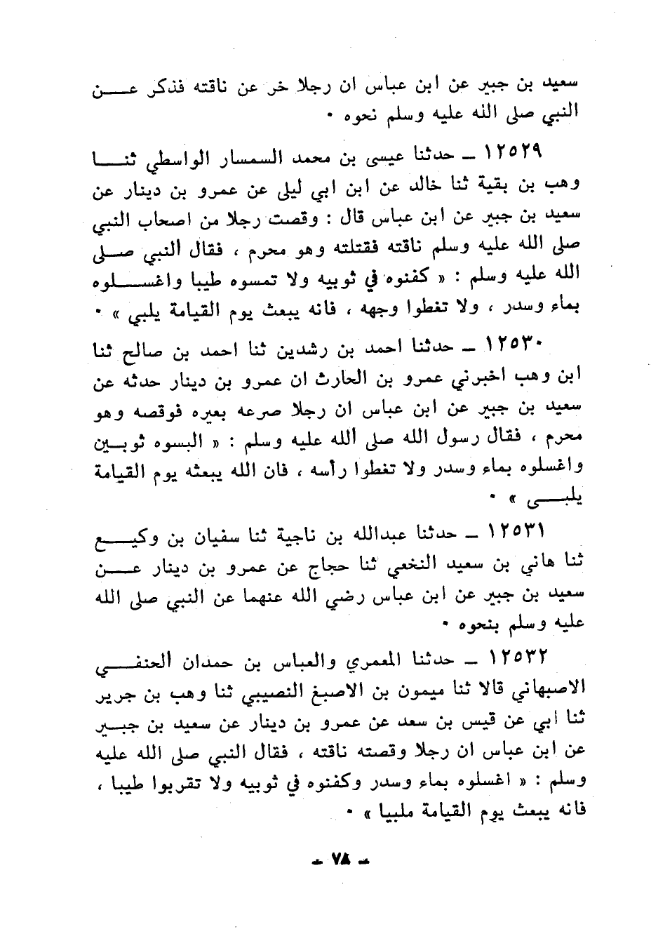 12532 - حَدَّثَنَا الْمَعْمَرِيُّ، وَالْعَبَّاسُ بْنُ حَمْدَانَ الْحَنَفِيُّ الْأَصْبَهَانِيُّ قَالَا: ثنا مَيْمُونُ بْنُ الْأَصْبَغِ النَّصِيبِيُّ، ثنا وَهْبُ بْنُ جَرِيرٍ، ثنا أَبِي، عَنْ قَيْسُ بْنُ سَعْدٍ، عَنْ عَمْرِو بْنِ دِينَارٍ، عَنْ سَعِيدِ بْنِ جُبَيْرٍ، عَنِ ابْنِ عَبَّاسٍ أَنَّ رَجُلًا، وَقَصَتْهُ نَاقَتُهُ، فَقَالَ النَّبِيُّ صَلَّى اللهُ عَلَيْهِ وَسَلَّمَ: «§اغْسِلُوهُ بِمَاءٍ وَسِدْرٍ، وَكَفِّنُوهُ فِي ثَوْبَيْهِ، وَلَا تُقَرِّبُوا طِيبًا، فَإِنَّهُ يُبْعَثُ يَوْمَ الْقِيَامَةِ مُلَبِّيًا»