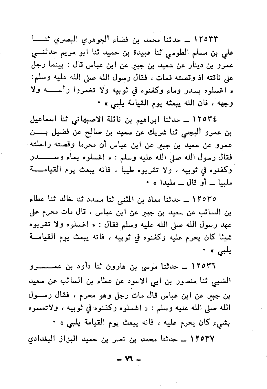 12536 - حَدَّثَنَا مُوسَى بْنُ هَارُونَ، ثنا دَاوُدُ بْنُ عَمْرٍو الضَّبِّيُّ، ثنا مَنْصُورُ بْنُ أَبِي الْأَسْوَدِ، عَنْ عَطَاءِ بْنِ السَّائِبِ، عَنْ سَعِيدِ بْنِ جُبَيْرٍ، عَنِ ابْنِ عَبَّاسٍ قَالَ: مَاتَ رَجُلٌ وَهُوَ مُحْرِمٌ , فَقَالَ رَسُولُ اللهِ صَلَّى اللهُ عَلَيْهِ وَسَلَّمَ: «§اغْسِلُوهُ وَكَفِّنُوهُ فِي ثَوْبَيْهِ، وَلَا تُمِسُّوهُ بِشَيْءٍ كَانَ يَحْرُمُ عَلَيْهِ فَإِنَّهُ يُبْعَثُ يَوْمَ الْقِيَامَةِ يُلَبِّي»
