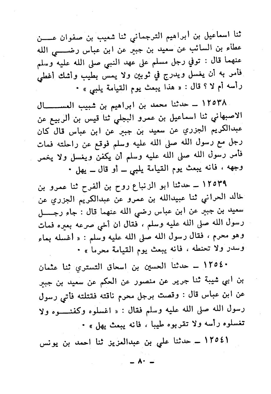 12541 - حَدَّثَنَا عَلِيُّ بْنُ عَبْدِ الْعَزِيزِ، ثنا أَحْمَدُ بْنُ يُونُسَ، ثنا فُضَيْلُ بْنُ عِيَاضٍ، عَنْ هِشَامِ بْنِ حَسَّانَ، عَنْ مَطَرٍ الْوَرَّاقِ، عَنْ سَعِيدِ بْنِ جُبَيْرٍ، عَنِ ابْنِ عَبَّاسٍ قَالَ: وَقَعَ رَجُلٌ عَنْ رَاحِلَتِهِ وَهُوَ مُحْرِمٌ، فَوَقَصَتْهُ، فَأُتِيَ رَسُولُ اللهِ صَلَّى اللهُ عَلَيْهِ وَسَلَّمَ فَذُكِرَ لَهُ ذَلِكَ , فَقَالَ: «§اغْسِلُوهُ بِمَاءٍ وَسِدْرٍ، وَكَفِّنُوهُ فِي ثَوْبَيْهِ، وَلَا تُخَمِّرُوا وَجْهَهُ، وَلَا تُمِسُّوهُ طِيبًا، فَإِنَّهُ يُبْعَثُ يَوْمَ الْقِيَامَةِ مُلَبِّيًا»
