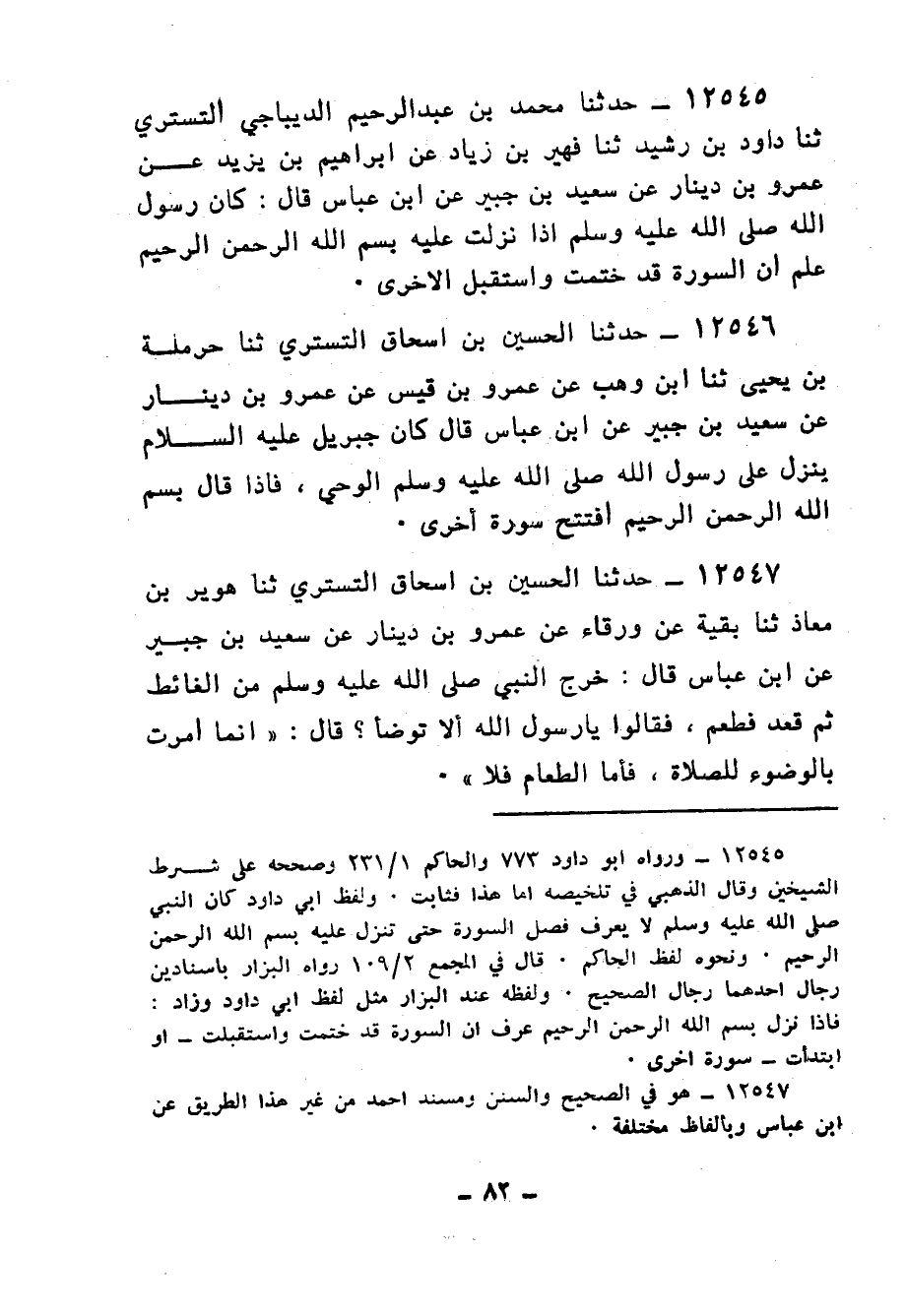 12545 - حَدَّثَنَا مُحَمَّدُ بْنُ عَبْدِ الرَّحِيمِ الدِّيبَاجِيُّ التُّسْتَرِيُّ، ثنا دَاوُدُ بْنُ رُشَيْدٍ، ثنا فُهَيْرِ بْنِ زِيَادٍ، عَنْ إِبْرَاهِيمَ بْنِ يَزِيدَ، عَنْ عَمْرِو بْنِ دِينَارٍ، عَنْ سَعِيدِ بْنِ جُبَيْرٍ، عَنِ ابْنِ عَبَّاسٍ قَالَ: " كَانَ رَسُولُ اللهِ صَلَّى اللهُ عَلَيْهِ وَسَلَّمَ: §إِذَا نَزَلَتْ عَلَيْهِ بِسْمِ اللهِ الرَّحْمَنِ الرَّحِيمِ عَلِمَ أَنَّ السُّورَةَ قَدْ خُتِمَتْ، وَاسْتَقْبَلَ الْأُخْرَى "