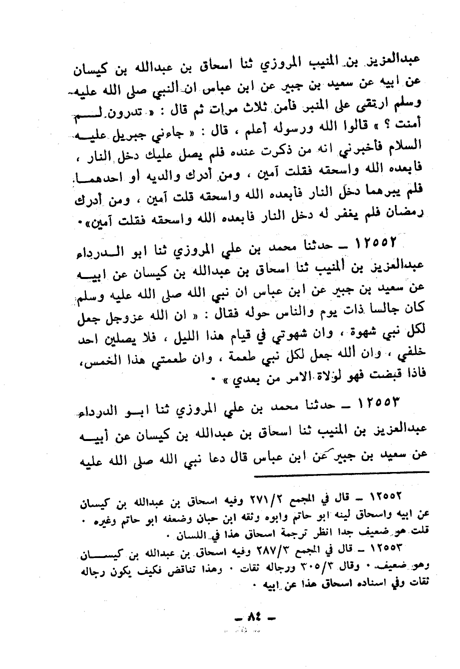 12552 - حَدَّثَنَا مُحَمَّدُ بْنُ عَلِيٍّ الْمَرْوَزِيُّ، ثنا أَبُو الدَّرْدَاءِ عَبْدُ الْعَزِيزِ بْنُ الْمُنِيبِ، ثنا إِسْحَاقُ بْنُ عَبْدِ اللهِ بْنِ كَيْسَانَ، عَنْ أَبِيهِ، عَنْ سَعِيدِ بْنِ جُبَيْرٍ، عَنِ ابْنِ عَبَّاسٍ أَنَّ نَبِيَّ اللهِ صَلَّى اللهُ عَلَيْهِ وَسَلَّمَ كَانَ جَالِسًا ذَاتَ يَوْمٍ وَالنَّاسُ حَوْلَهُ، فَقَالَ: «إِنَّ §اللهَ عَزَّ وَجَلَّ جَعَلَ لِكُلِّ نَبِيٍّ شَهْوَةً، وَإِنَّ شَهْوَتِي فِي قِيَامِ هَذَا اللَّيْلِ، فَلَا يُصَلِّيَنَّ أَحَدٌ خَلْفِي، وَإِنَّ اللهَ جَعَلَ لِكُلِّ نَبِيٍّ طُعْمَةً، وَإِنَّ طُعْمَتِي هَذَا الْخُمُسُ، فَإِذَا قُبِضْتُ فَهُوَ لِوُلَاةِ الْأَمْرِ مِنْ بَعْدِي»