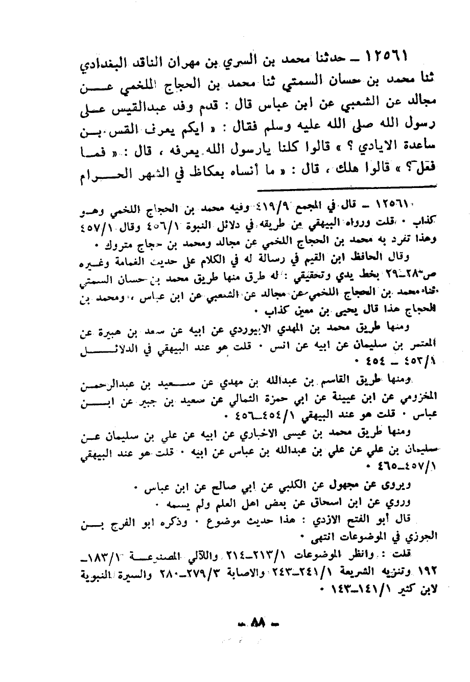 12561 - حَدَّثَنَا مُحَمَّدُ بْنُ السَّرِيِّ بْنُ مِهْرَانَ النَّاقِدُ الْبَغْدَادِيُّ، ثنا مُحَمَّدُ بْنُ حَسَّانَ السَّمْتِيُّ، ثنا مُحَمَّدُ بْنُ الْحَجَّاجِ اللَّخْمِيُّ، عَنْ مُجَالِدٍ، عَنِ الشَّعْبِيِّ، عَنِ ابْنِ عَبَّاسٍ قَالَ: قَدِمَ وَفْدُ عَبْدِ الْقَيْسِ عَلَى رَسُولِ اللهِ صَلَّى اللهُ عَلَيْهِ وَسَلَّمَ , فَقَالَ: «أَيُّكُمْ يَعْرِفُ الْقُسَّ بْنَ سَاعِدَةَ الْإِيَادِيَّ؟» قَالُوا: كُلُّنَا يَا رَسُولَ اللهِ يَعْرِفُهُ. قَالَ: «فَمَا فَعَلَ؟» قَالُوا: هَلَكَ قَالَ: " §مَا أَنْسَاهُ بِعُكَاظٍ فِي الشَّهْرِ الْحَرَامِ وَهُوَ عَلَى جَمَلٍ أَحْمَرَ، وَهُوَ يَخْطُبُ النَّاسَ، وَهُوَ يَقُولُ: يَا أَيُّهَا النَّاسُ اجْتَمِعُوا، وَاسْتَمَعُوا وَعُوا، مَنْ عَاشَ مَاتَ، وَمَنْ مَاتَ فَاتَ، وَكُلُّ مَا هُوَ آتٍ آتٍ، إِنَّ فِي السَّمَاءِ لَخَبَرًا , وَإِنَّ فِي الْأَرْضِ لَعِبَرًا , مِهَادٌ مَوْضُوعٌ، وَسَقْفٌ مَرْفُوعٌ , وَنُجُومٌ تَمُورُ , وَبِحَارٌ لَا تَغُورُ، أَقْسَمَ قُسٌّ قَسَمًا حَقًّا لَئِنْ كَانَ فِي الْأَرْضِ رِضًا لَيَكُونَنَّ بَعْدَهُ سَخَطٌ، إِنَّ لِلَّهِ لَدِينًا هُوَ أَحَبُّ إِلَيْهِ مِنْ دِينِكُمُ الَّذِي أَنْتُمْ عَلَيْهِ، مَالِي أَرَى النَّاسَ يَذْهَبُونَ وَلَا يَرْجِعُونَ؟ أَرَضُوا فَأَقَامُوا، أَمْ تُرِكُوا فَنَامُوا؟ ثُمَّ، قَالَ صَلَّى اللهُ عَلَيْهِ وَسَلَّمَ: «أَفِيكُمْ مَنْ يَرْوِي شِعْرَهُ؟» فَأَنْشَدَهُ: بَعْضُهُمْ: