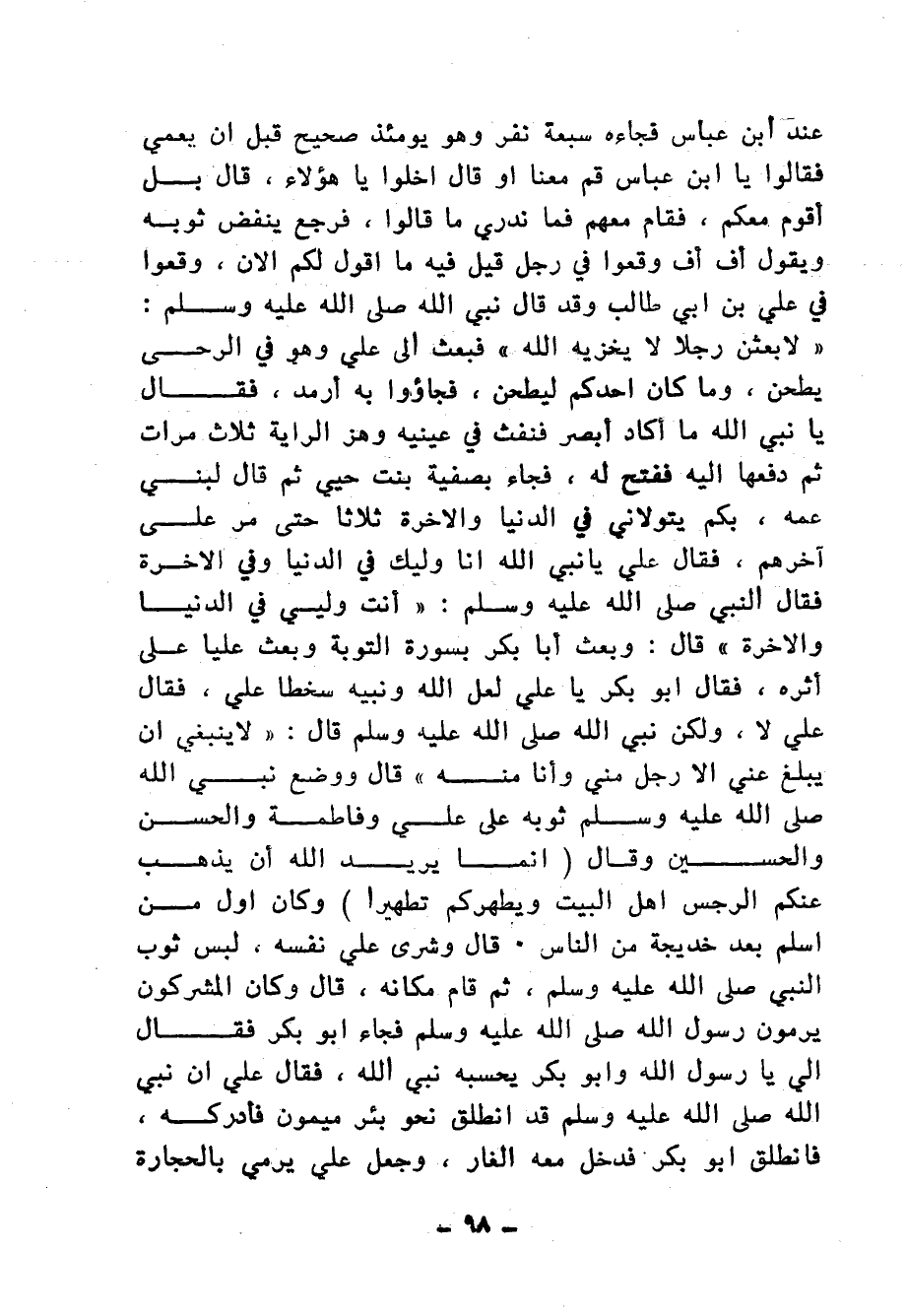 12593- حَدَّثَنَا إِبْرَاهِيمُ بْنُ هَاشِمٍ الْبَغَوِيُّ ، حَدَّثَنَا كَثِيرُ بْنُ يَحْيَى ، حَدَّثَنَا أَبُو عَوَانَةَ ، عَنْ أَبِي بَلْجٍ ، عَنْ عَمْرِو بْنِ مَيْمُونٍ قَالَ : كُنَّا عِنْدَ ابْنِ عَبَّاسَ ، فَجَاءَهُ سَبْعَةُ نَفَرٍ وهُوَ يَوْمَئِذٍ صَحِيحٌ ، قَبْلَ أَنْ يَعْمَى ، فَقَالُوا : يَا ابْنَ عَبَّاسٍ قُمْ مَعَنَا ، أَوْ قَالَ : اخْلُوا يَا هَؤُلاَءِ . قَالَ : بَلْ أَقُومُ مَعَكُمْ ، فَقَامَ مَعَهُمْ فَمَا نَدْرِي مَا قَالُوا ، فَرَجَعَ يَنْفُضُ ثَوْبَهُ ، وَيَقُولُ : أُفٍّ أُفٍّ ، وَقَعُوا فِي رَجُلٍ قِيلَ فِيهِ مَا أَقُولُ لَكُمُ الآنَ ، وَقَعُوا فِي عَلِيِّ بْنِ أَبِي طَالِبٍ ، وَقَدْ قَالَ نَبِيُّ اللهِ صَلَّى اللَّهُ عَلَيْهِ وَسَلَّمَ : لأَبْعَثَنَّ رَجُلاً لاَ يُخْزِيهِ اللَّهُ فَبَعَثَ إِلَى عَلِيٍّ وَهُوَ فِي الرَّحَى يَطْحَنُ ، وَمَا كَانَ أَحَدُكُمْ لِيَطْحَنَ ، فَجَاؤُوا بِهِ أَرْمَدَ ، فَقَالَ : يَا نَبِيَّ اللهِ مَا أَكَادُ أُبْصِرُ ، فَنَفَثَ فِي عَيْنيهِ وَهَزَّ الرَّايَةَ ثَلاَثَ مَرَّاتٍ ، ثُمَّ دَفَعَهَا إِلَيْهِ فَفُتِحَ لَهُ ، فَجَاءَ بِصَفِيَّةَ بِنْتِ حُيَيٍّ ، ثُمَّ قَالَ لِبَنِي عَمِّهِ : أَيُّكُمْ يَتَوَلاَّنِي فِي الدُّنْيَا وَالآخِرَةِ ثَلاَثًا حَتَّى مَرَّ عَلَى آخِرِهِمْ ، فَقَالَ عَلِيٌّ : يَا نَبِيَّ اللهِ أَنَا وَلِيُّكَ فِي الدُّنْيَا وَفِي الآخِرَةِ ، فَقَالَ النَّبِيُّ صَلَّى اللَّهُ عَلَيْهِ وَسَلَّمَ : أَنْتَ وَلِيِّي فِي الدُّنْيَا وَالآخِرَةِ قَالَ : وَبَعَثَ أَبَا بَكْرٍ بِسُورَةِ التَّوْبَةِ ، وَبَعَثَ عَلِيًّا عَلَى أَثَرِهِ ، فَقَالَ أَبُو بَكْرٍ : يَا عَلِيُّ لَعَلَّ اللَّهَ وَنَبِيَّهُ سَخِطَا عَلَيَّ ، فَقَالَ عَلِيٌّ : لاَ ، وَلَكِنَّ نَبِيَّ اللهِ صَلَّى اللَّهُ عَلَيْهِ وَسَلَّمَ قَالَ : لاَ يَنْبَغِي أَنْ يُبَلِّغَ عَنِّي إِلاَّ رَجُلٌ مِنِّي ، وَأَنَا مِنْهُ قَالَ : وَوَضَعَ نَبِيُّ اللهِ صَلَّى اللَّهُ عَلَيْهِ وَسَلَّمَ ثَوْبَهُ عَلَى عَلِيٍّ وَفَاطِمَةَ ، وَالْحَسَنِ ، وَالْحُسَيْنِ ، وَقَالَ : إِنَّمَا يُرِيدُ اللَّهُ أَنْ يُذْهِبَ عَنْكُمُ الرِّجْسَ أَهْلَ الْبَيْتِ وَيُطَهِّرَكُمْ تَطْهِيرًا ، وَكَانَ أَوَّلَ مَنْ أَسْلَمَ بَعْدَ خَدِيجَةَ مِنَ النَّاسِ ، قَالَ وَشَرَى عَلِيٌّ نَفْسَهُ ، لَبِسَ ثَوْبَ النَّبِيِّ صَلَّى اللَّهُ عَلَيْهِ وَسَلَّمَ ، ثُمَّ قَامَ مَكَانَهُ ، قَالَ وَكَانَ الْمُشْرِكُونَ يَرْمُونَ رَسُولَ اللهِ صَلَّى اللَّهُ عَلَيْهِ وَسَلَّمَ , فَجَاءَ أَبُو بَكْرٍ , فَقَالَ إِلَيَّ : يَا رَسُولَ اللهِ , وَأَبُو بَكْرٍ يَحْسَبُهُ نَبِيَّ اللهِ ،